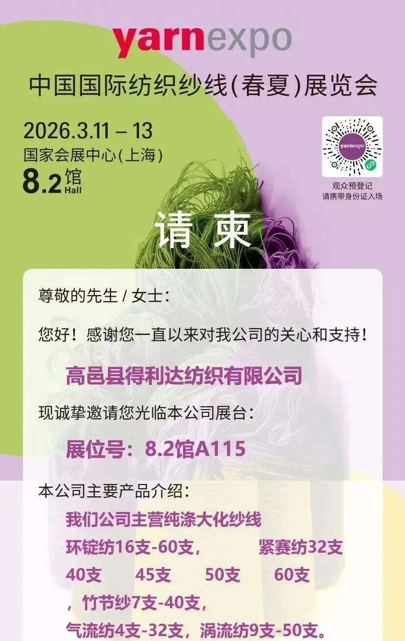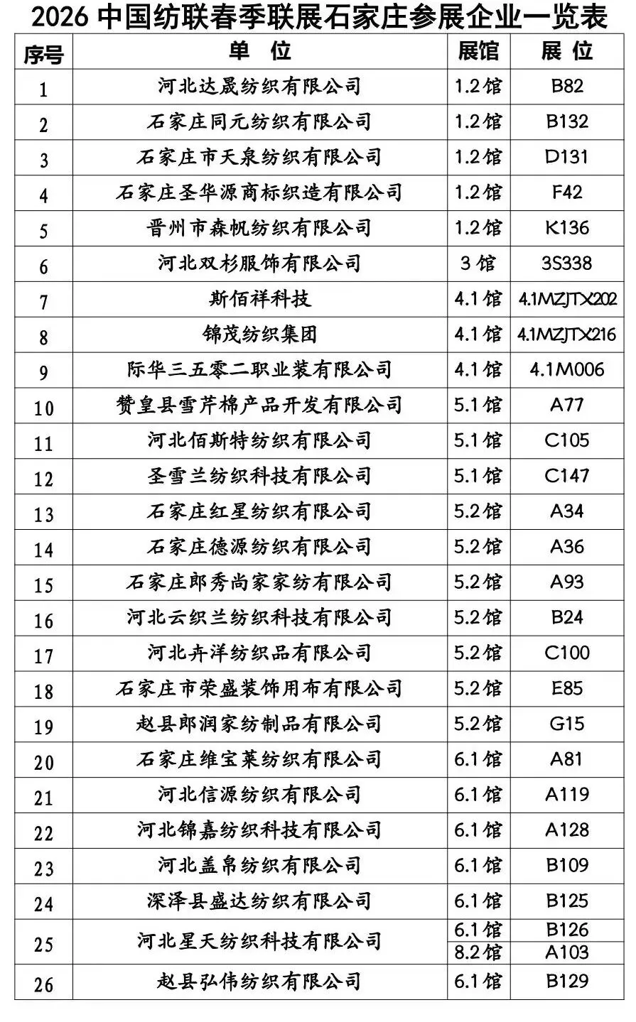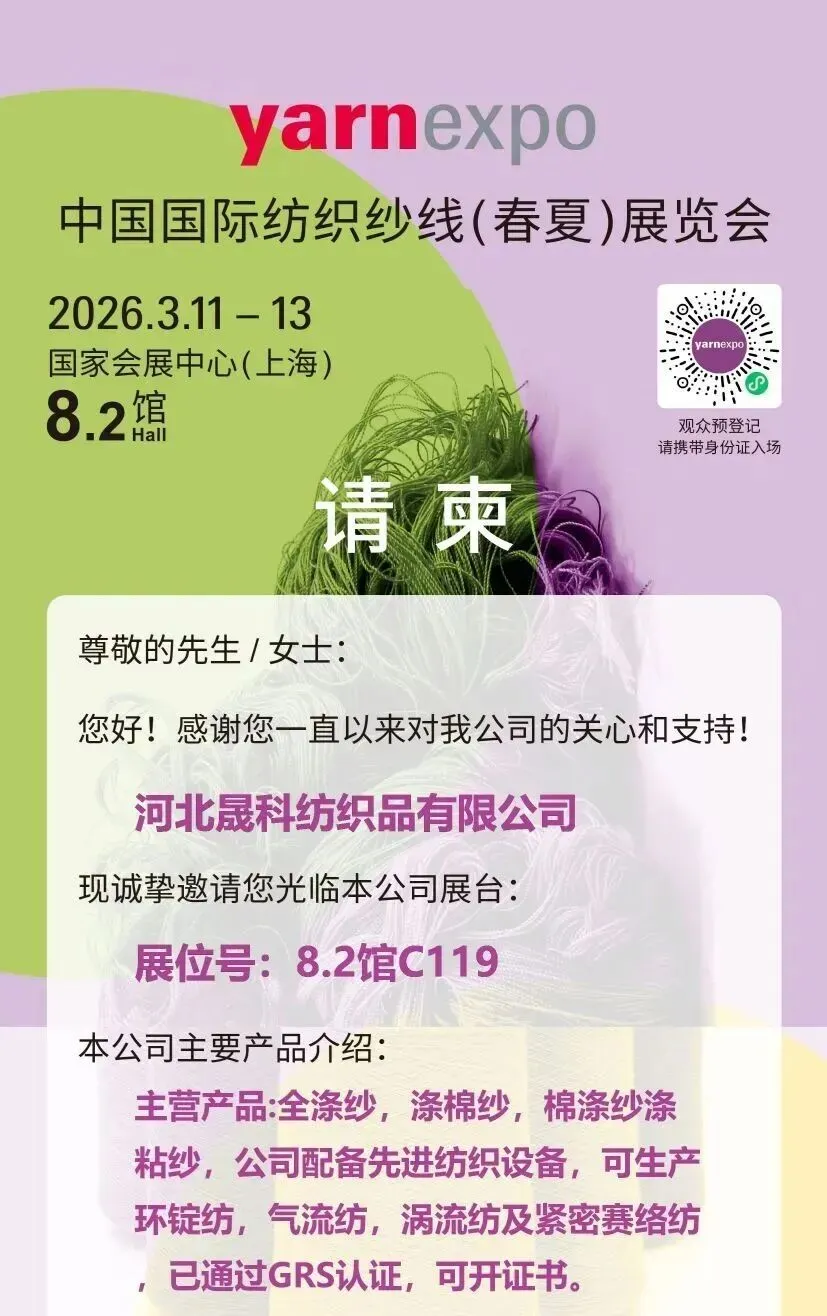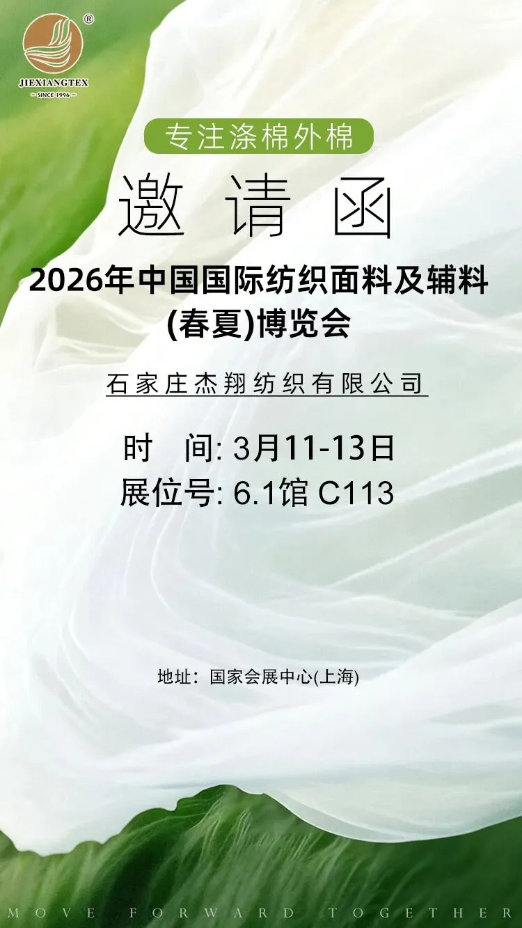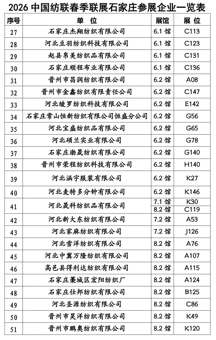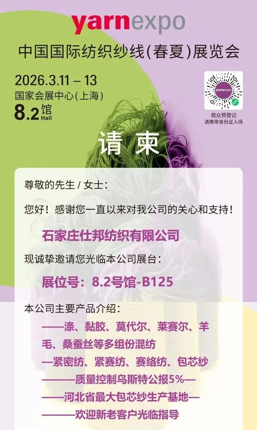 春潮涌动,万物竞发。2026年3月11日至13日,中国纺织工业联合会春季联展将再度于国家会展中心(上海)举办。本届联展汇聚五大专业展会——中国国际纺织面料及辅料(春夏)博览会、中国国际服装服饰博览会(春季)、中国国际家用纺织品及辅料(春夏)博览会、中国国际纺织纱线(春夏)展览会及中国国际针织(春夏)博览会,形成覆盖纺织全产业链的综合性行业平台。石家庄市51家纺织服装企业蓄势待发,将参展2026中国纺联春季联展。欢迎海内外新老客户朋友光临石家庄展位参观洽谈,期待马到成功,共创佳绩。