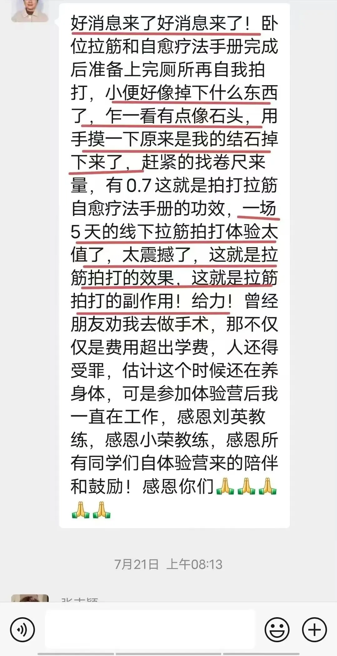 结石患者:“5 天体验营太值了!通过集体共振结石直接排出,不用忍受手术之苦,还不耽误工作,感恩这份意外收获!”