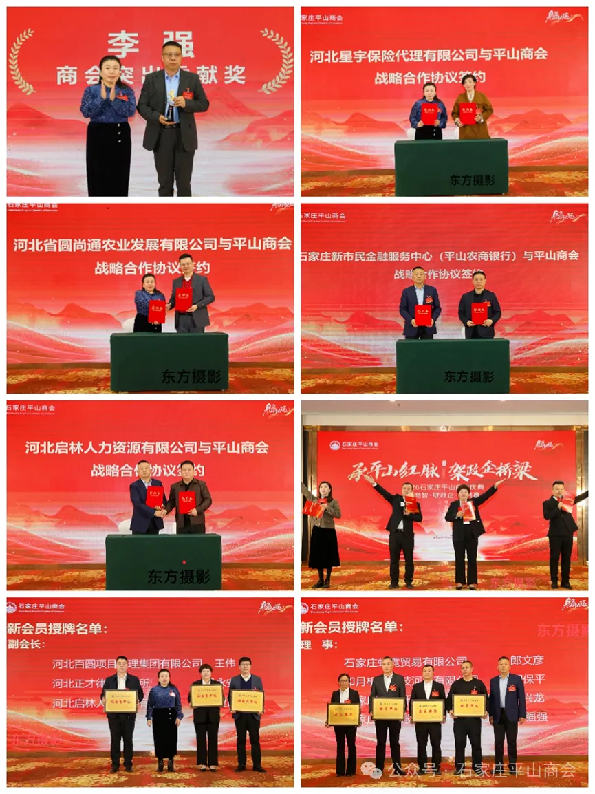 平山商会荣获平山县政府授予的“爱心服务中心”称号,这是政府对我们商会的最高嘉奖,倍感鼓舞,倍感荣幸,爱心服务中心的授牌,是政府对商会公益行动的权威认可。全体理事在大会上庄严宣誓,彰显担当与决心。会上对优秀理事进行了表彰颁奖!平山商会与河北星宇保险代理有限公司、河北省圆尚通农业发展有限公司、石家庄新市民金融服务中心、河北启林人力资源有限公司签订了战略合作协议。