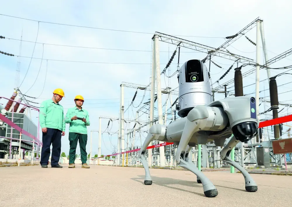 在220千伏韩通变电站设备区,国网石家庄供电公司试点应用于变电站巡检工作的“机器狗”联动“变电哨兵”高清监控摄像头进行全站巡检工作。