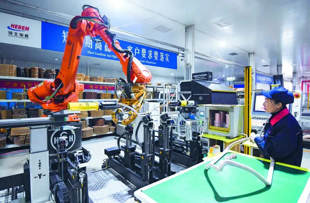 在河北电机股份有限公司的智能化装配车间,机械臂进行产品组装作业。