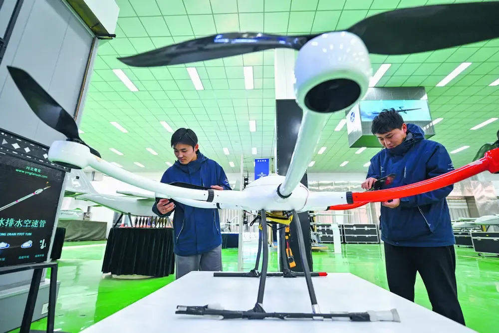 在河北鹰览自动化科技有限公司,技术人员对无人机设备进行检查。