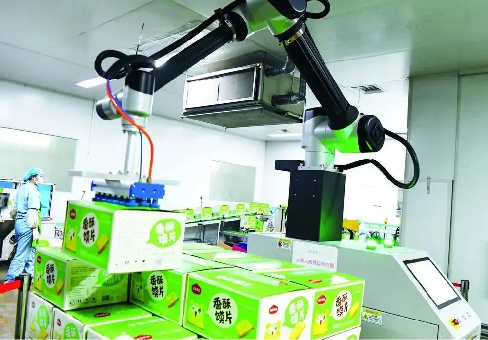 在石家庄市栾城区马家麦坊食品有限公司外包装车间,机器人在进行膜片食品的生产作业。本报记者 张震 摄
