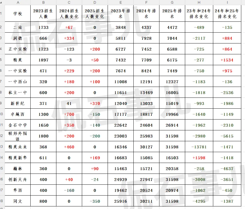 私立一中、新世纪、卓越西近三年排名大幅下滑,私立一中2023年11651名,2025年跌至16005名,退步4354名;新世纪2023年12040名,2025年跌至15019名,退步2979名;金石中学2023年22642名,2025年跌至26914名,退步4272名……