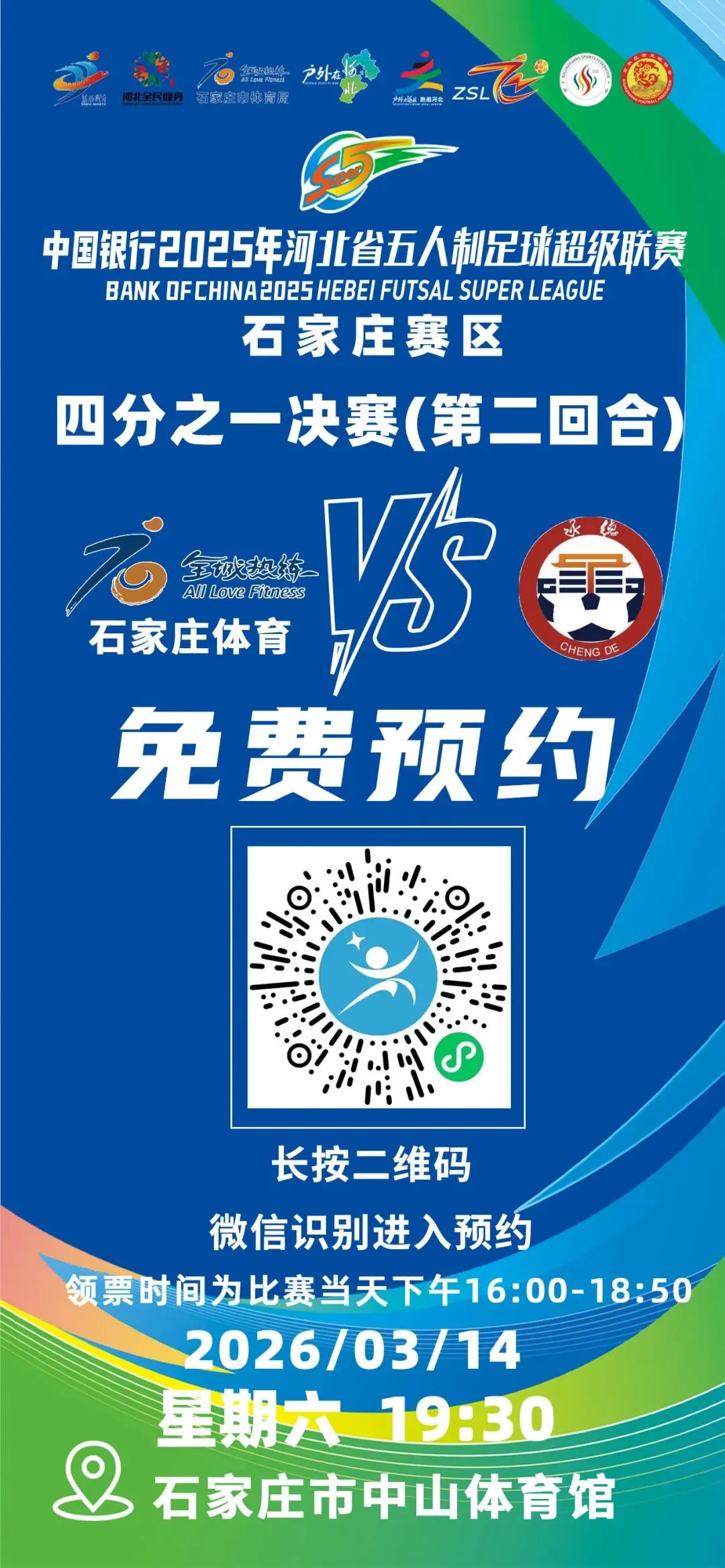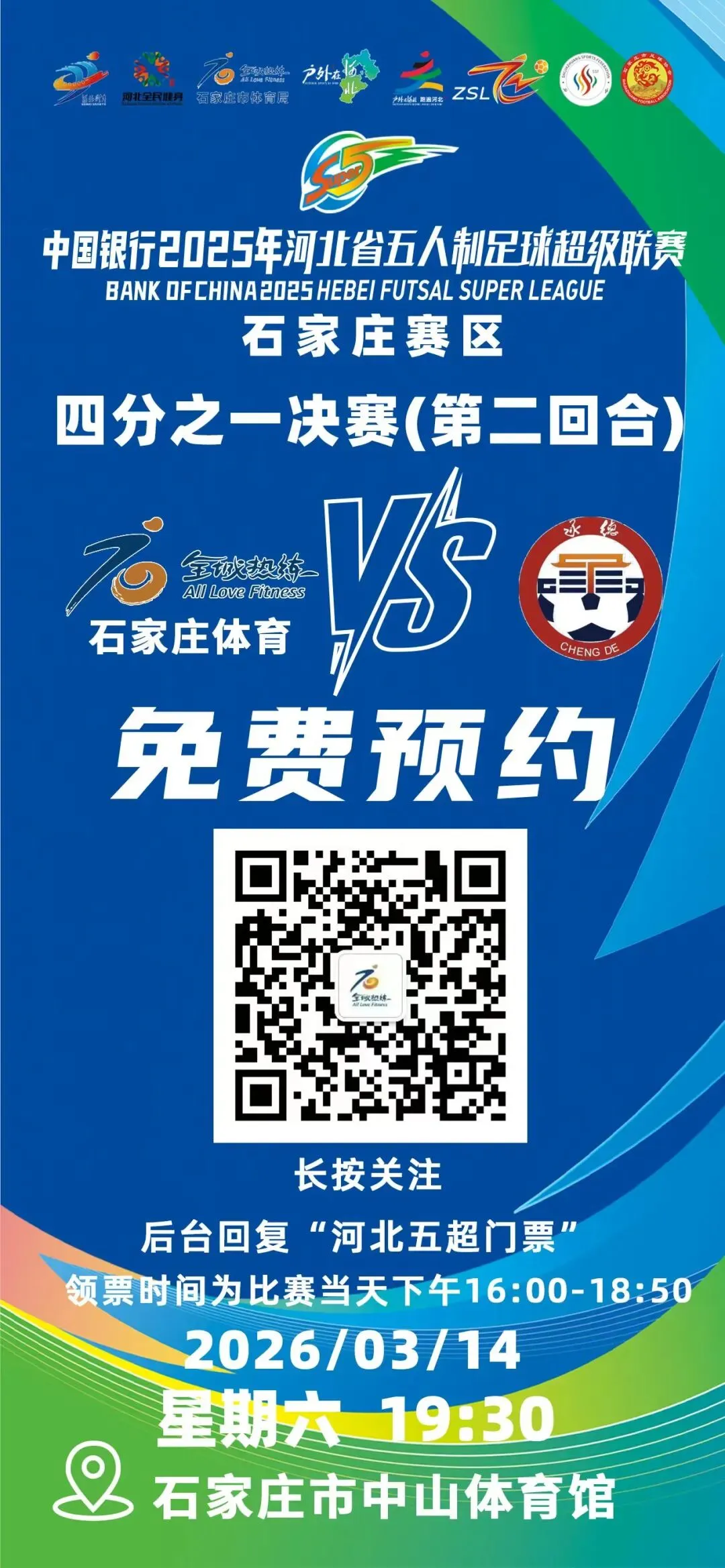 1.长按门票预约海报二维码,关注官方账号后在后台回复【河北五超门票】,即可获取赛事门票预约链接。