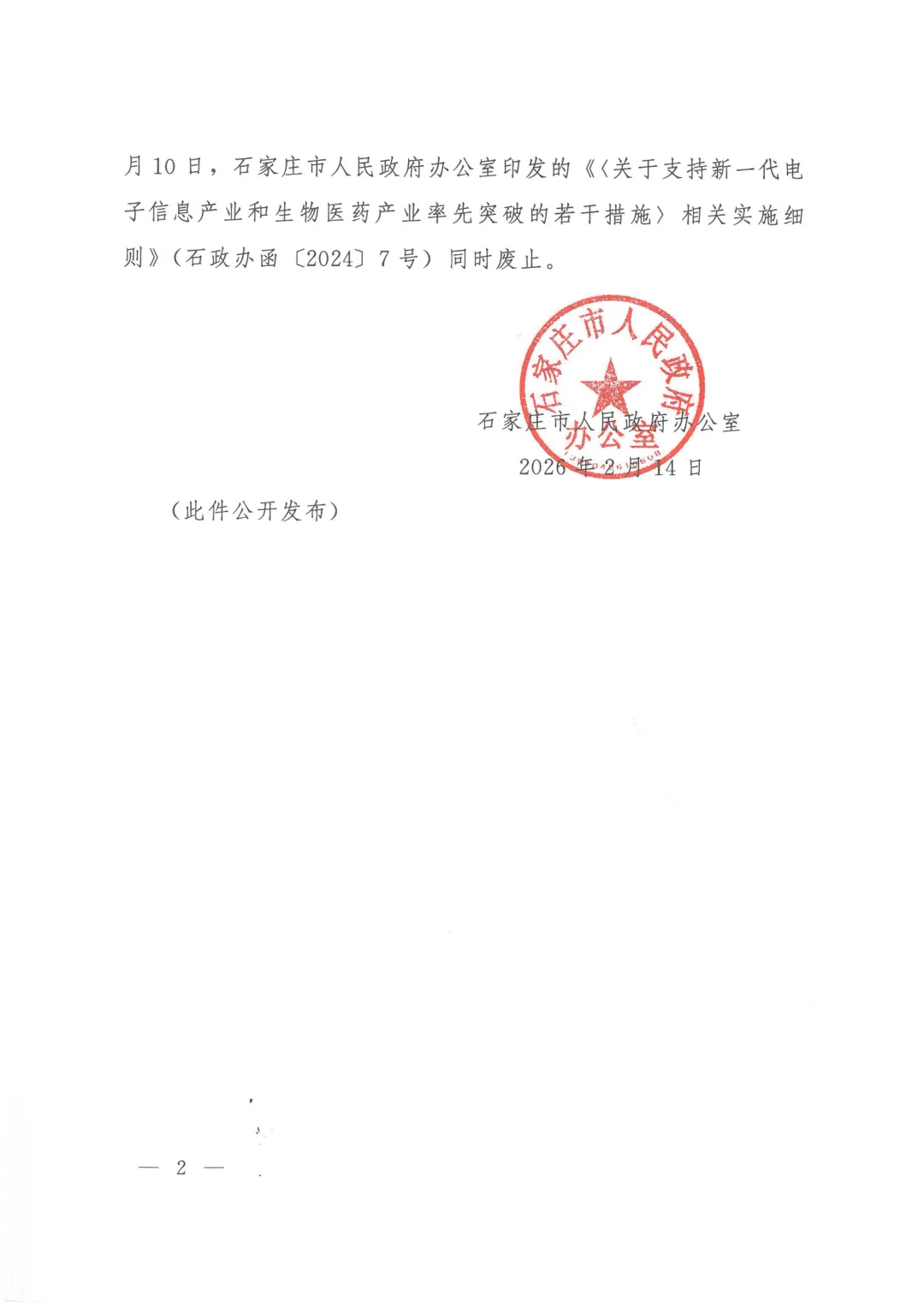 石家庄市人民政府办公室印发 《<关于支持新一代电子信息产业和生物医药产业率先突破的若干措施>相关实施细则》的通知