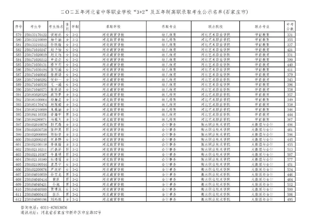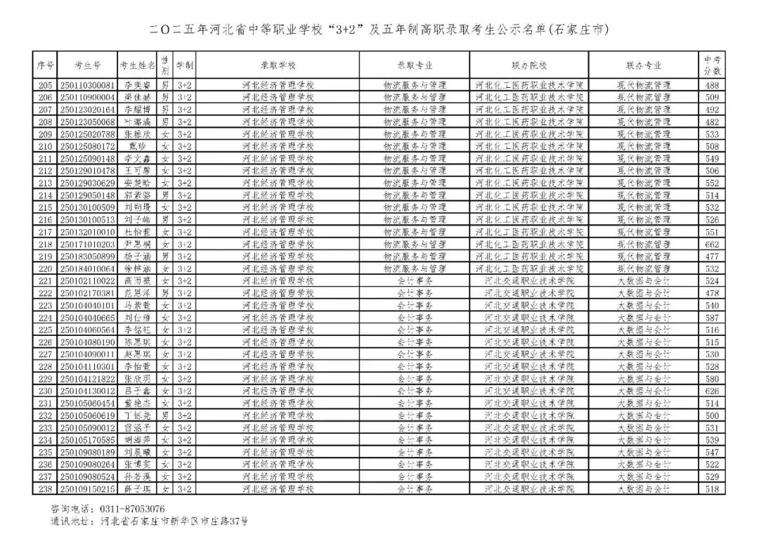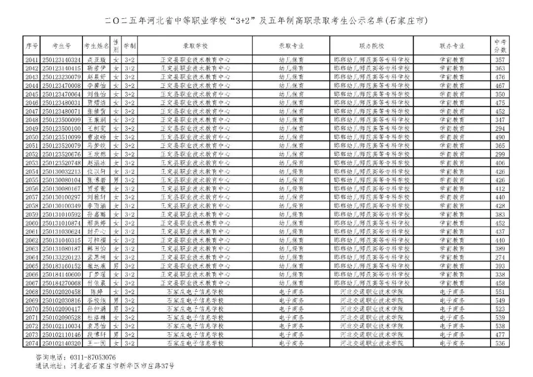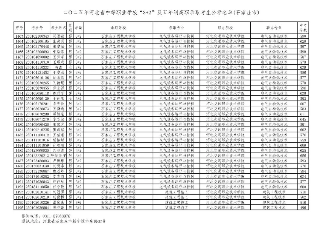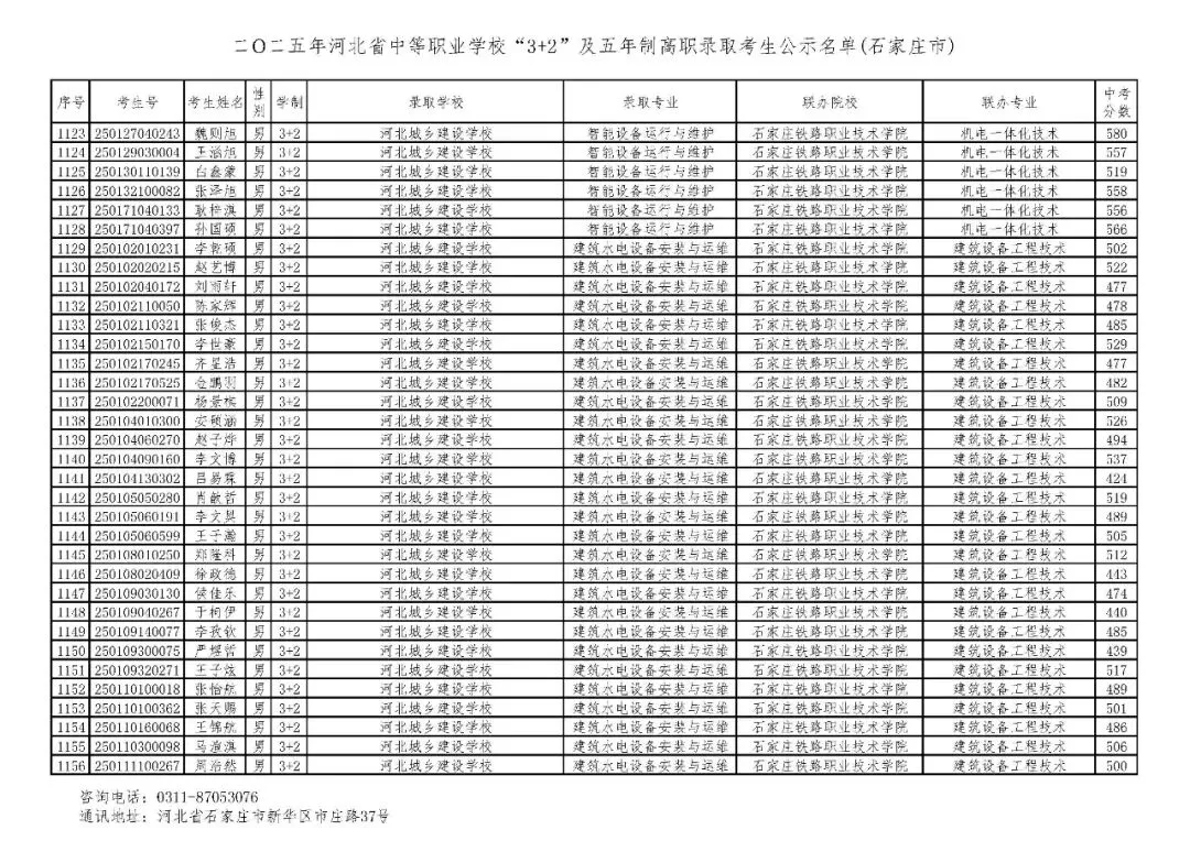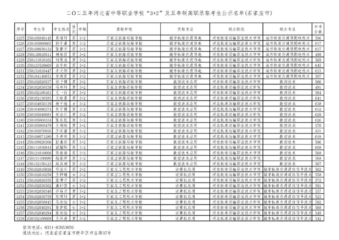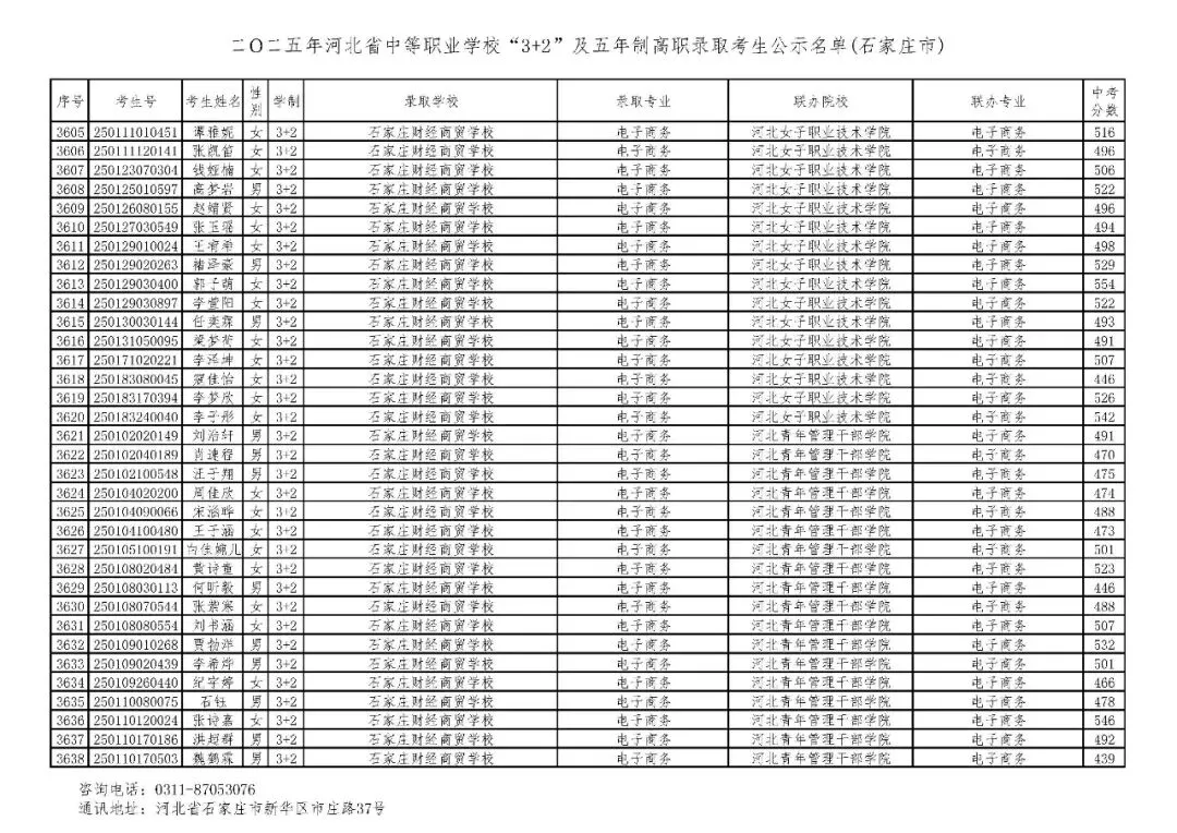 >石家庄市2025年中考,五年一贯制、3+2录取分数线
