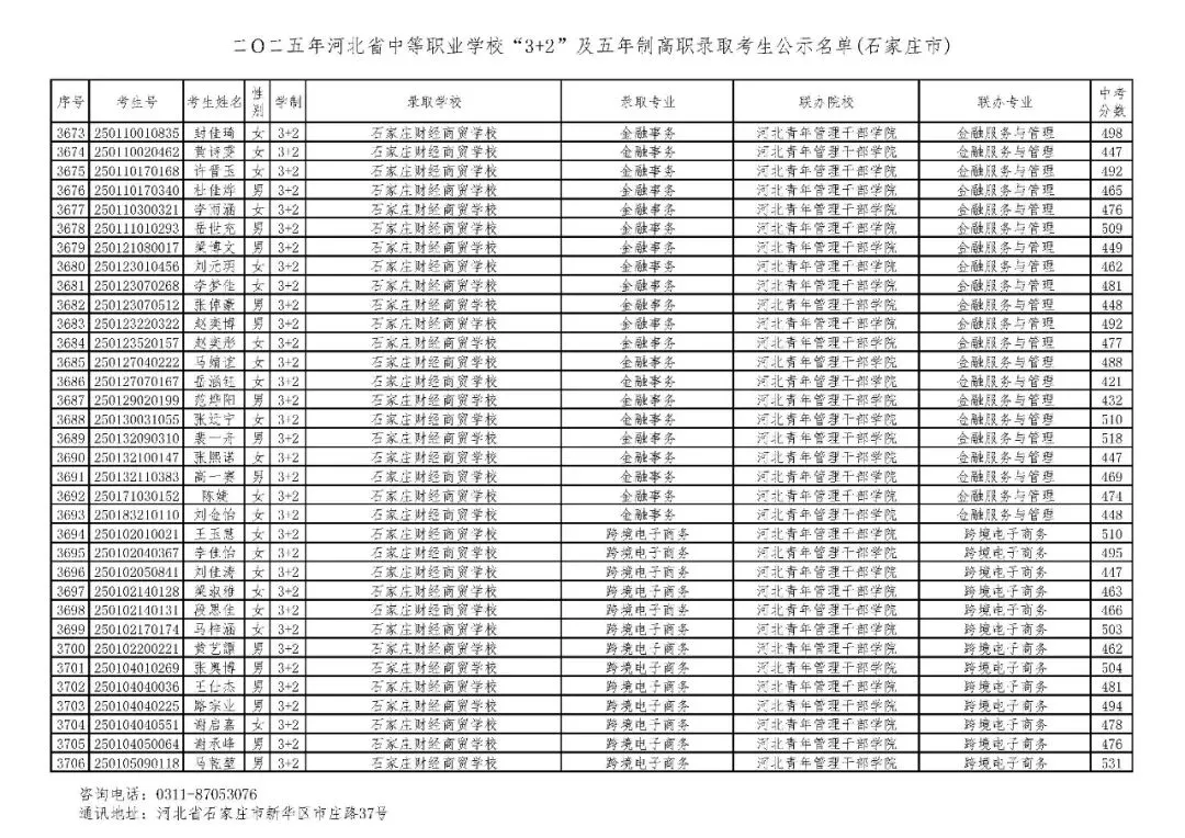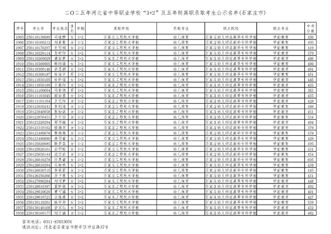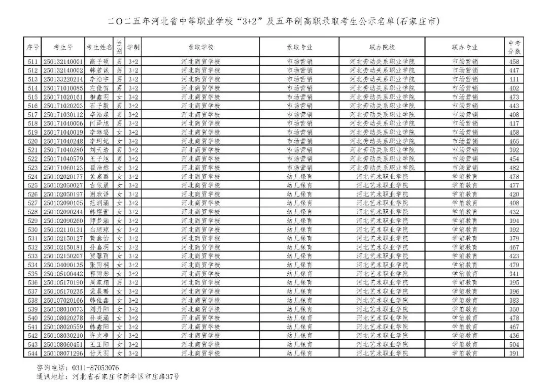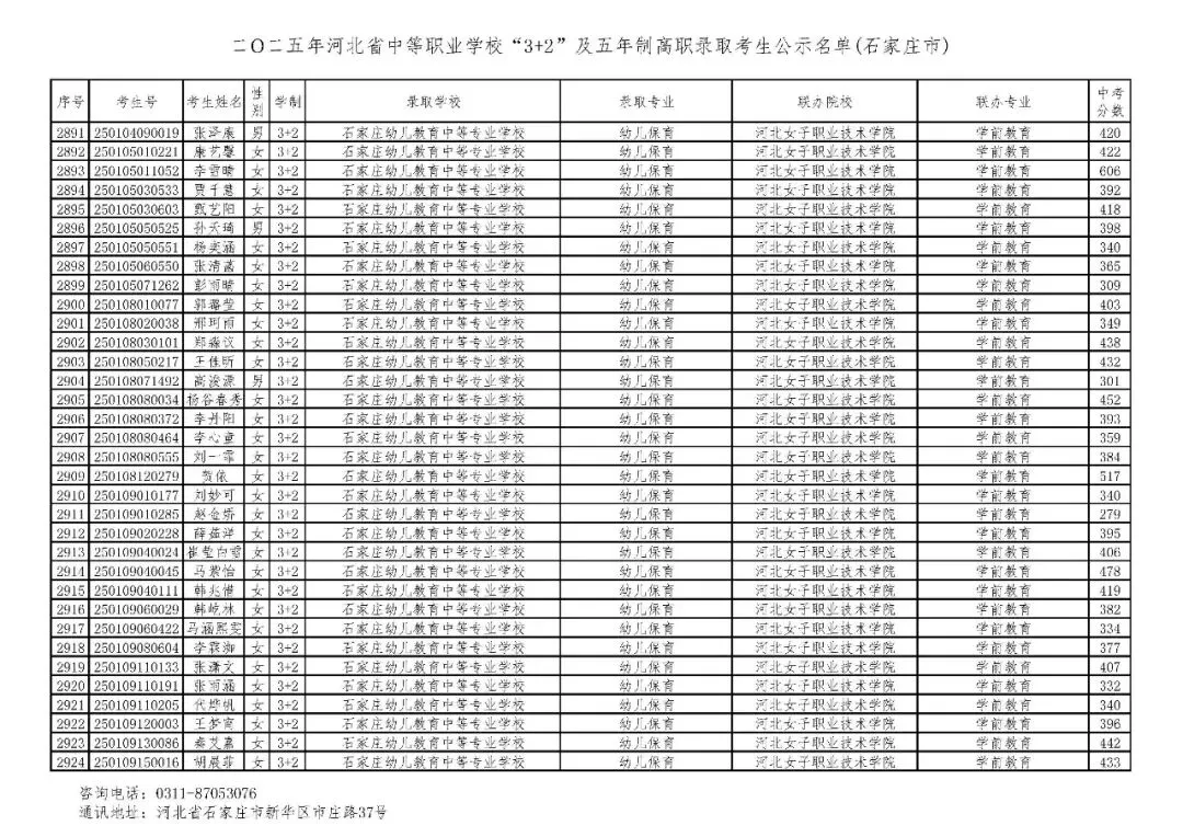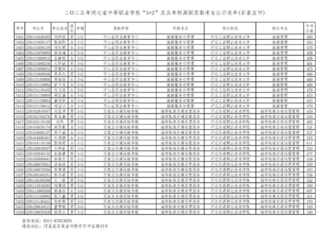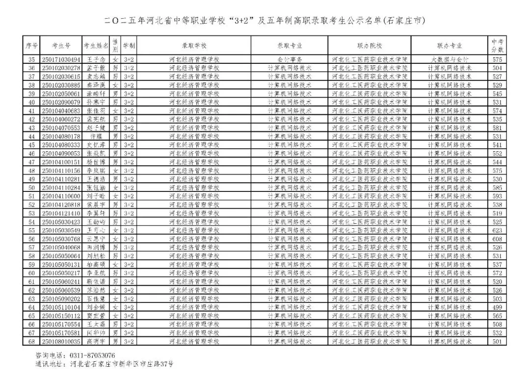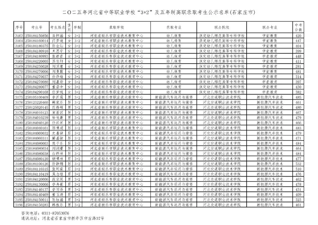 >石家庄市2025年中考,五年一贯制、3+2录取分数线
