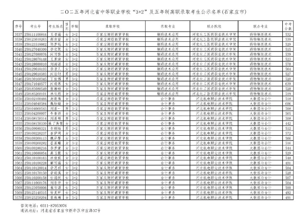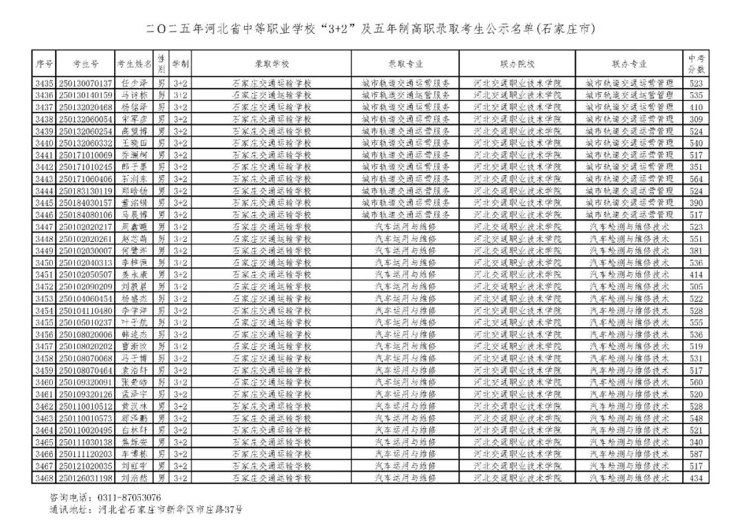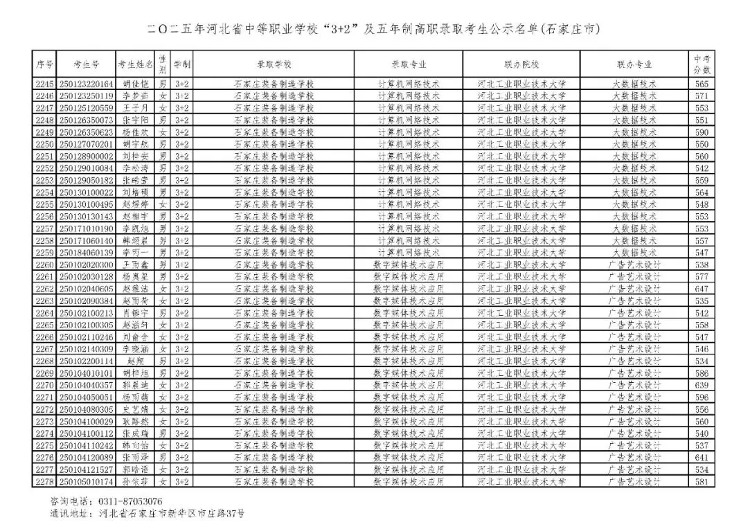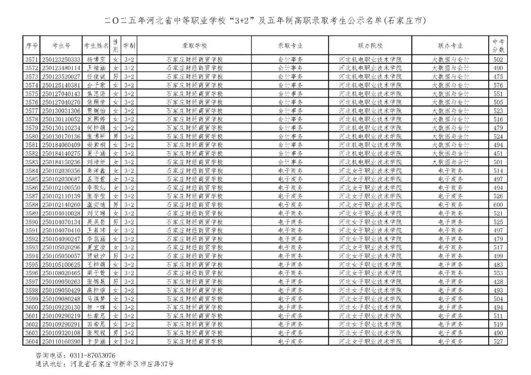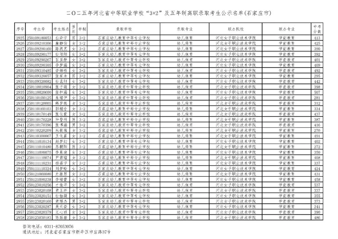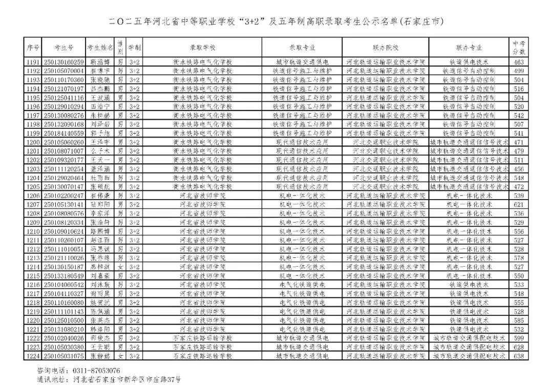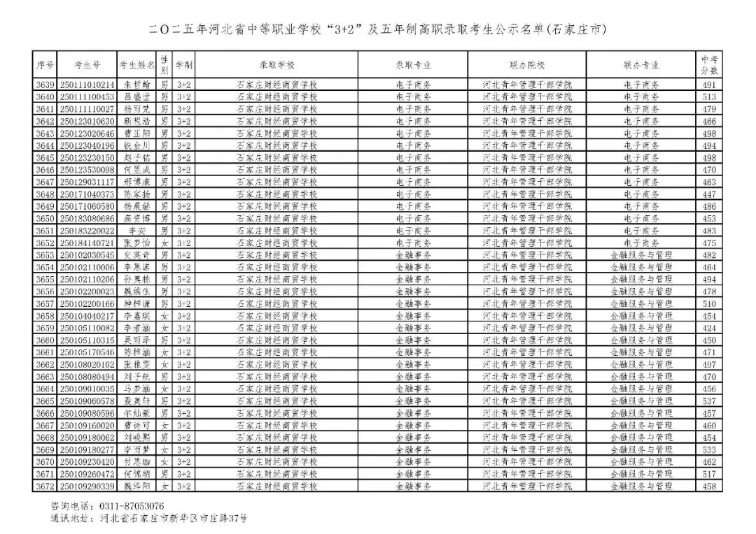 >石家庄市2025年中考,五年一贯制、3+2录取分数线