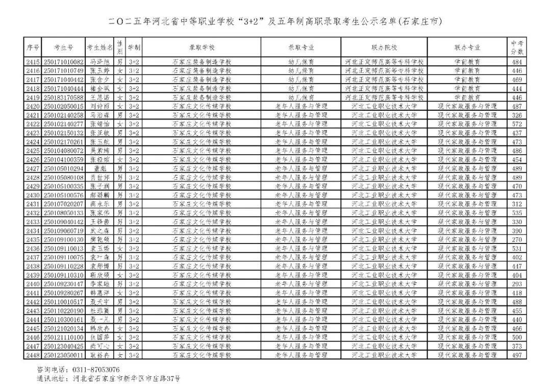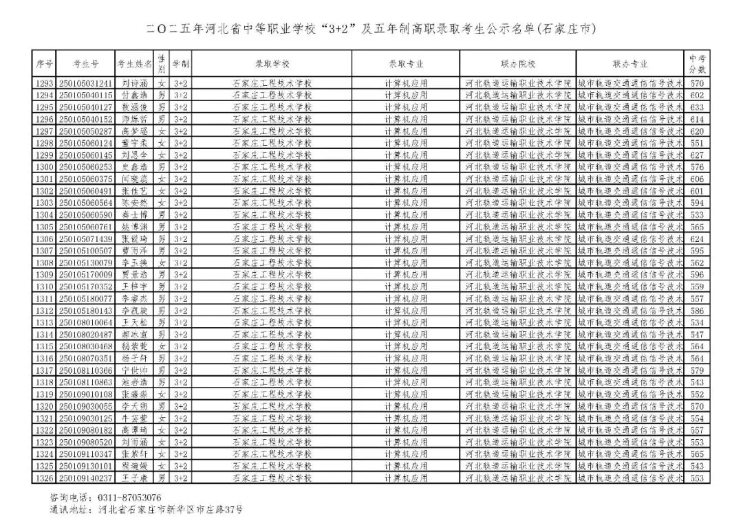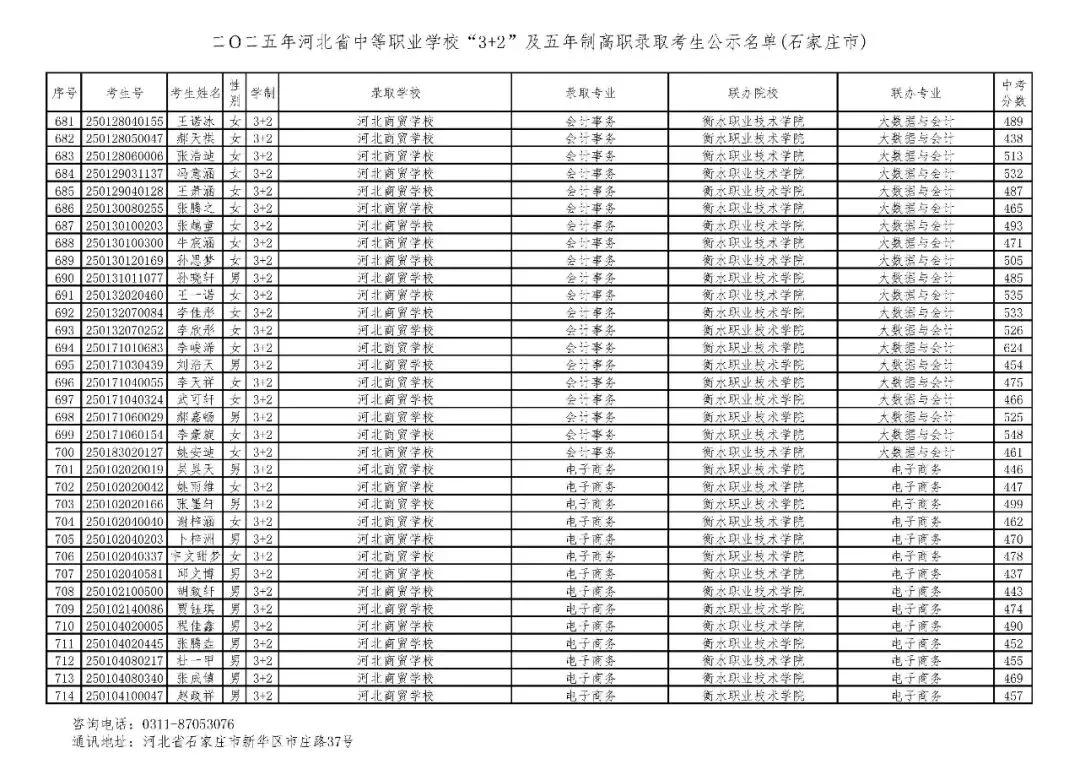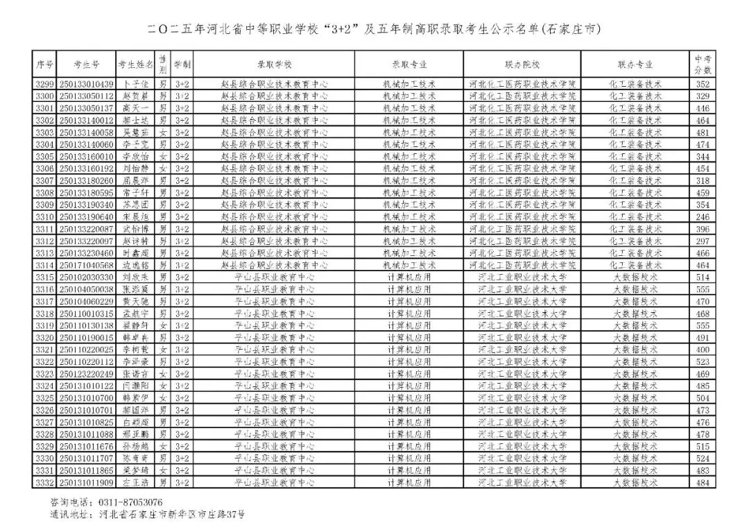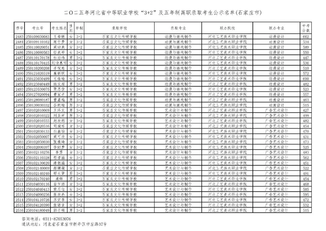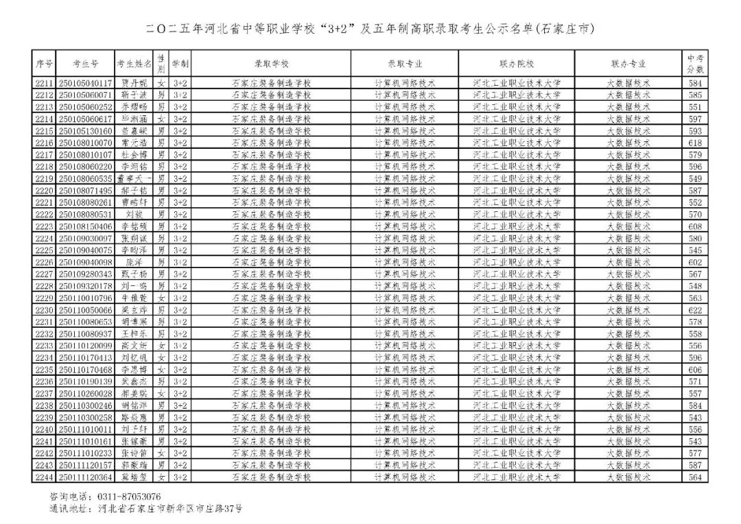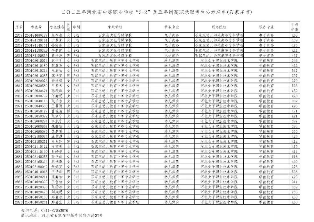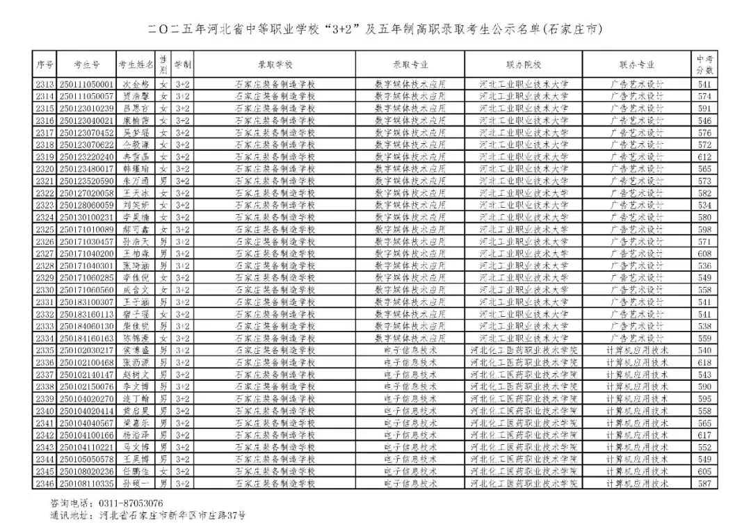 >石家庄市2025年中考,五年一贯制、3+2录取分数线