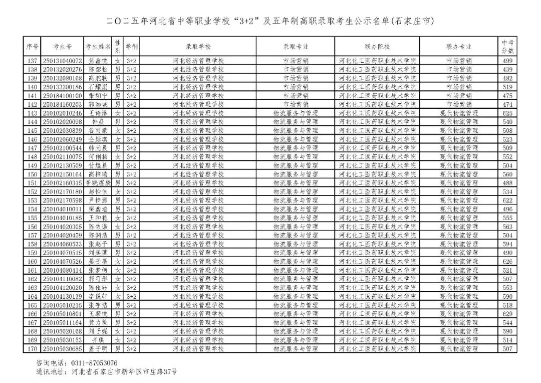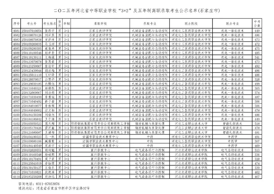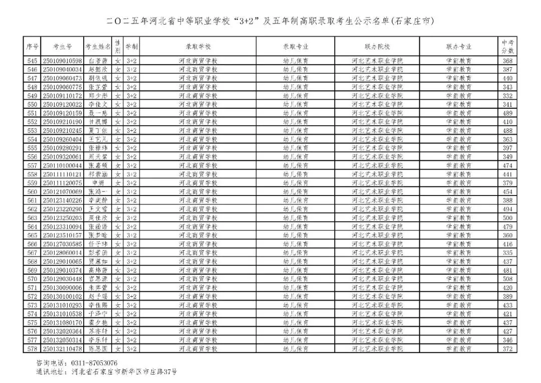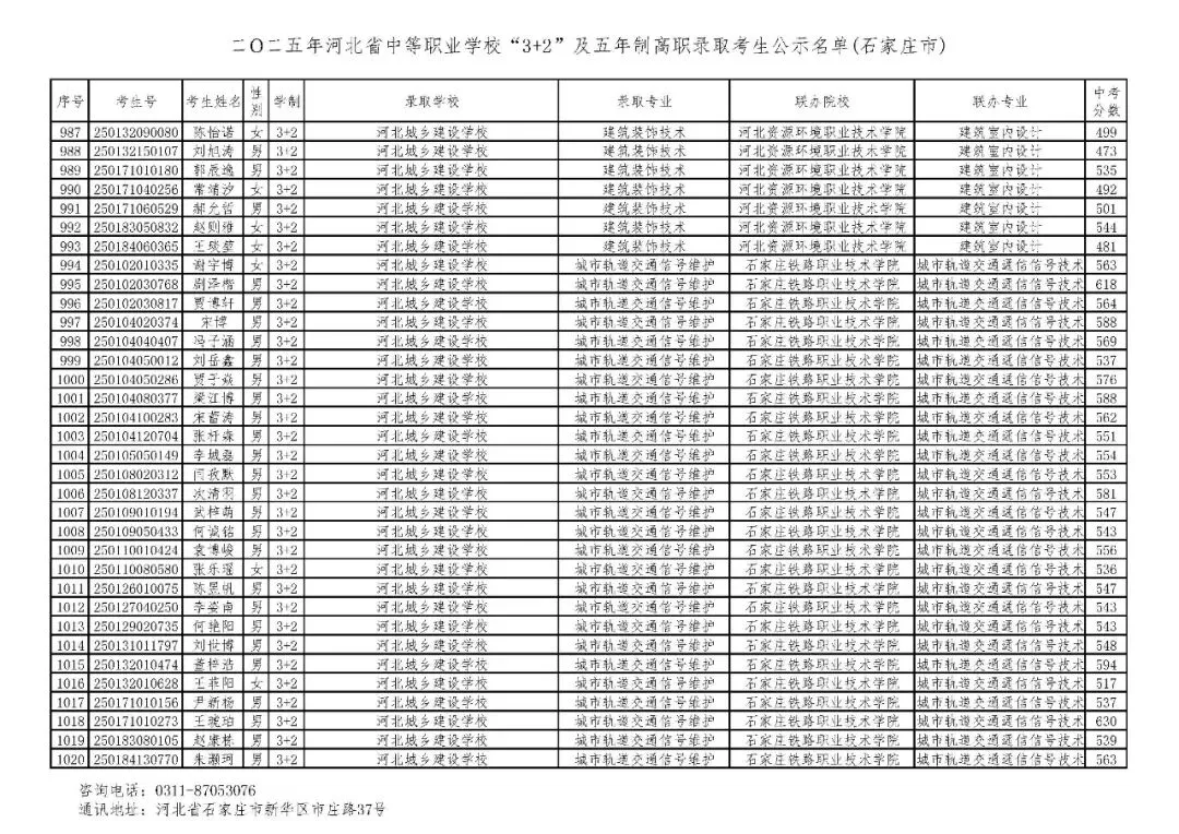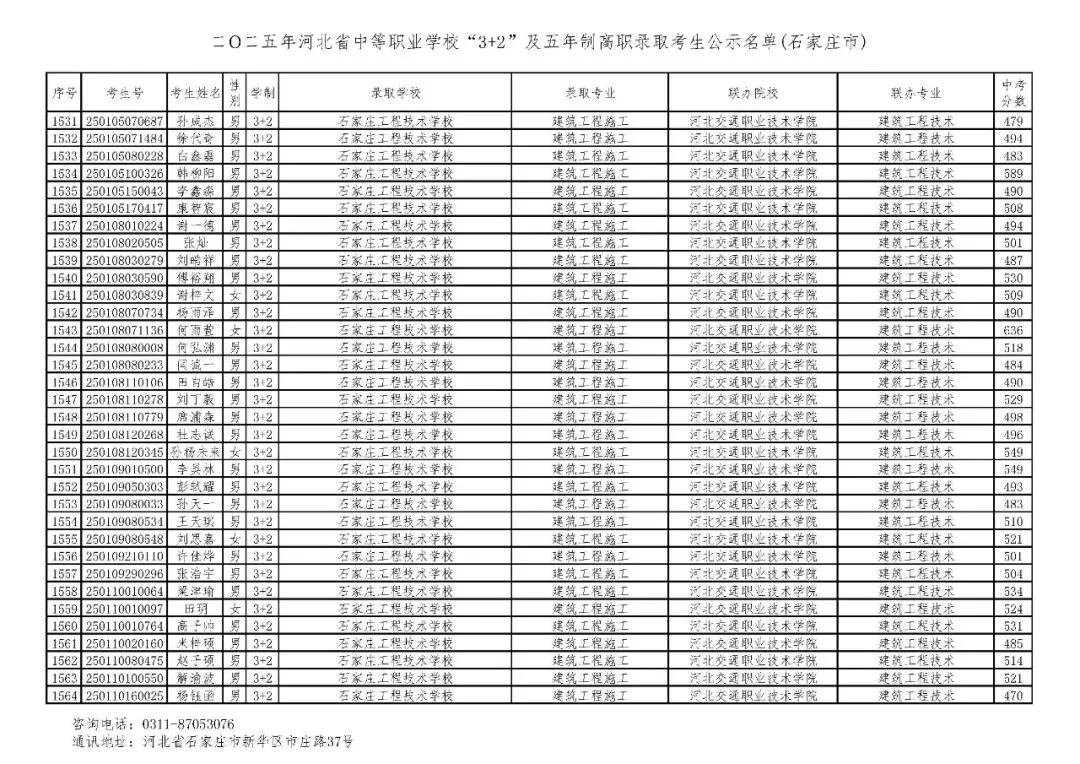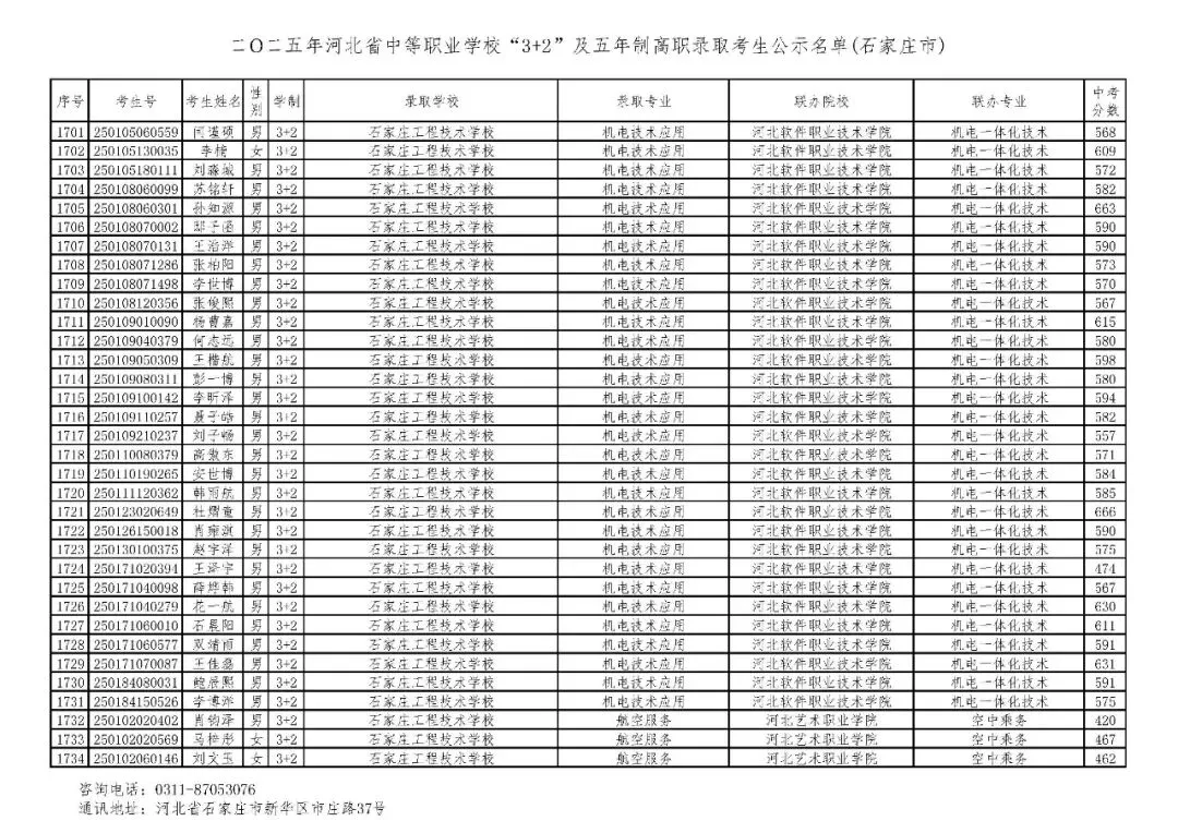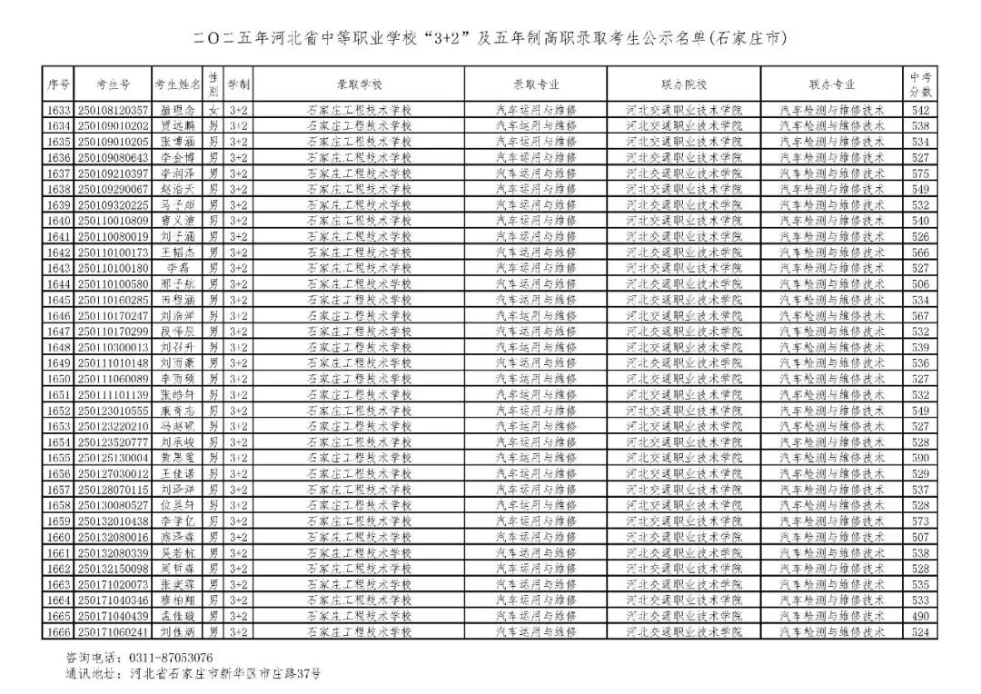 >石家庄市2025年中考,五年一贯制、3+2录取分数线