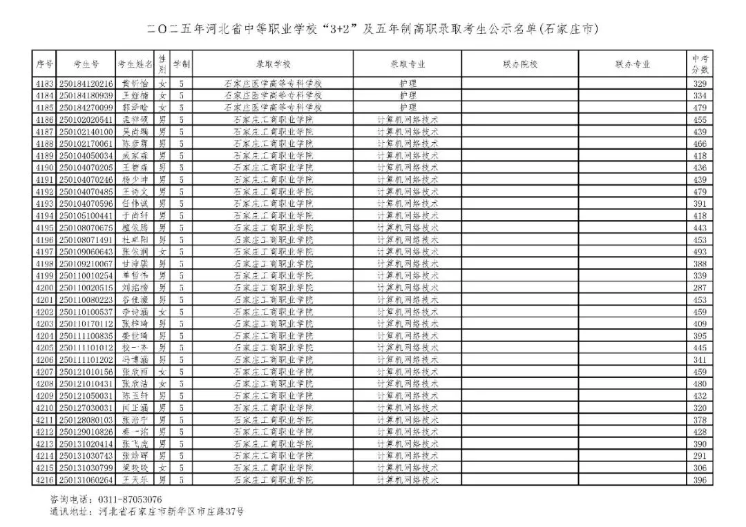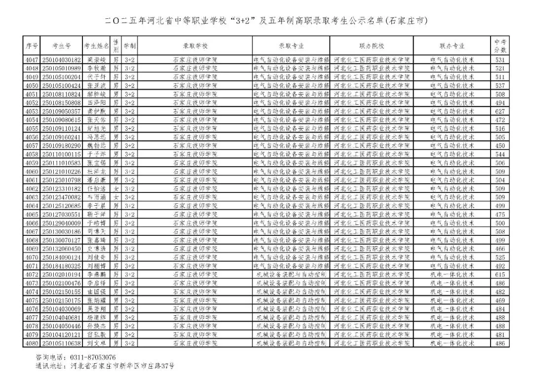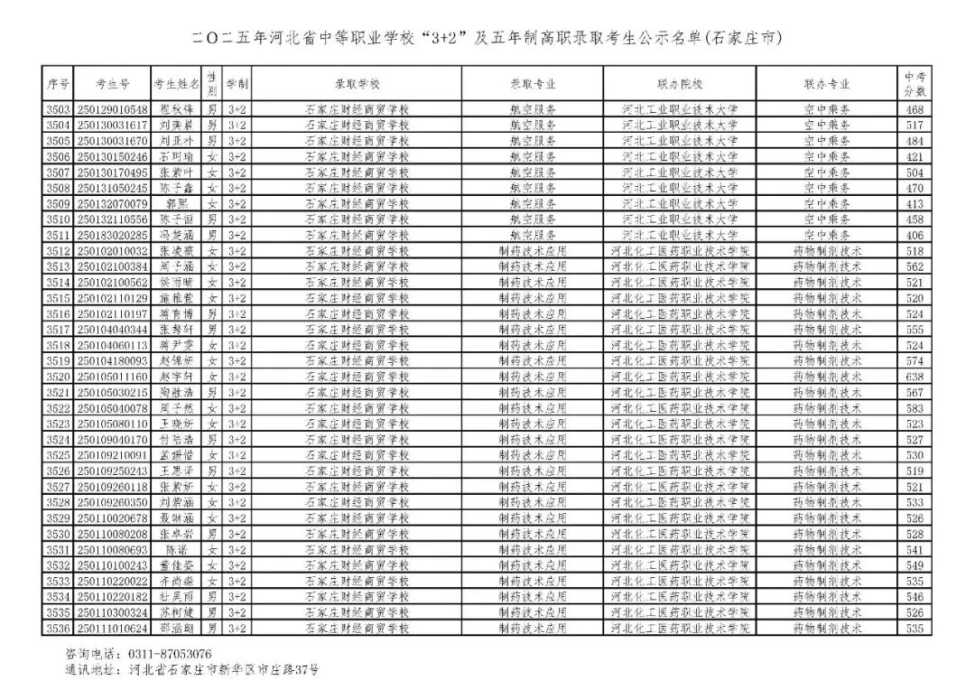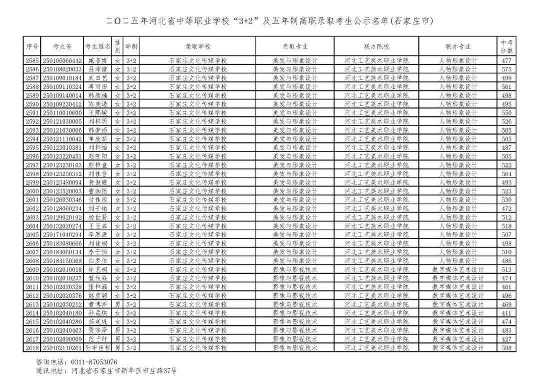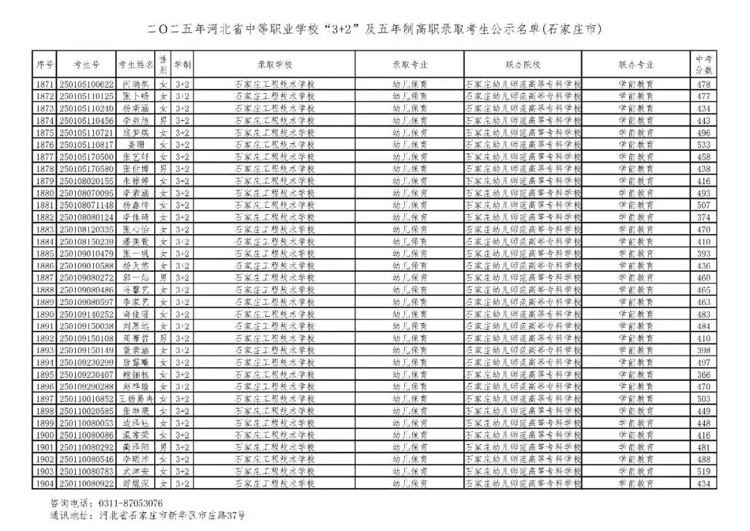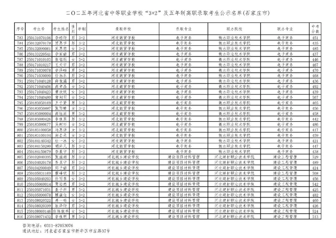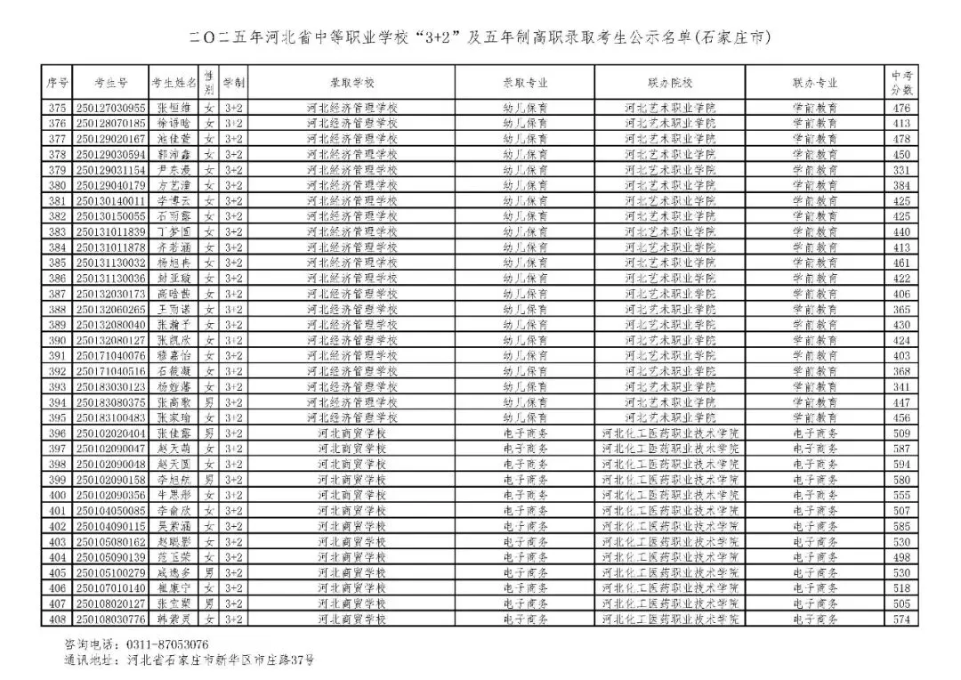 >石家庄市2025年中考,五年一贯制、3+2录取分数线