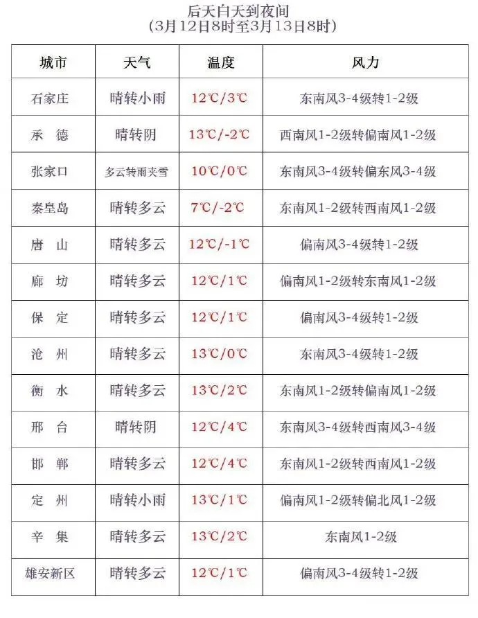 12日夜间到13日,东南部地区多云间阴,坝上地区多云转阴有雨夹雪或小雪,其他地区多云转阴有小雨或零星雨夹雪。