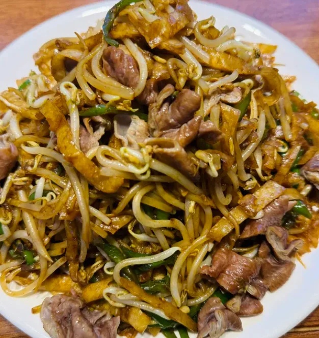 焖饼做法其实家常:五花肉先煸出油,下豆角或圆白菜翻炒,加酱油和一点水,铺上切细的饼丝,小火焖几分钟,让饼把汤汁吃进去,最后大火翻匀,蒜末一撒就出锅。关键不在料多,而在火候稳。