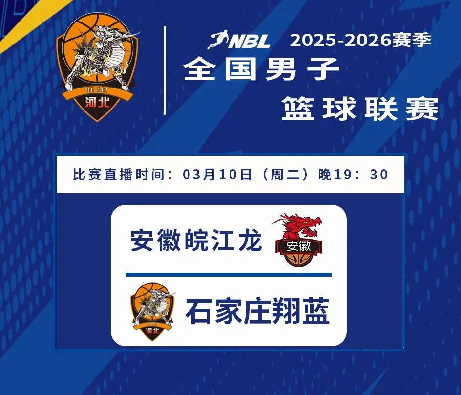 3月10日19点30分,石家庄翔蓝将在本赛季NBL联赛常规赛第二十二轮比赛中,客场挑战安徽皖江龙。