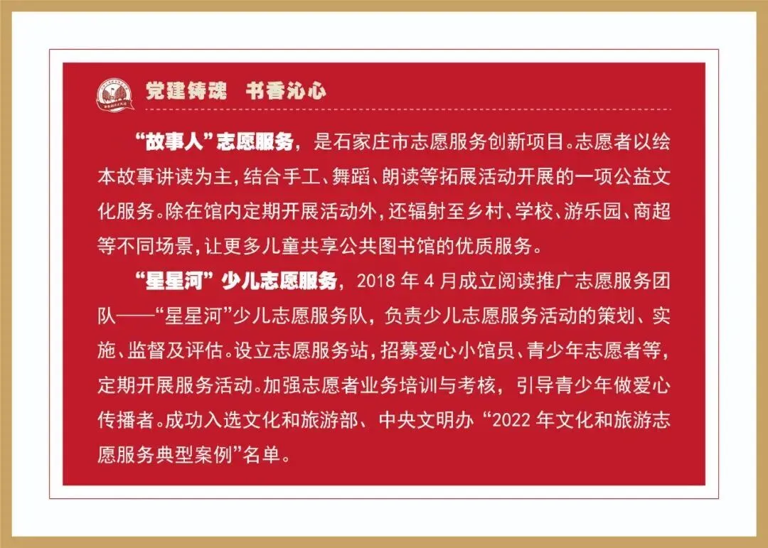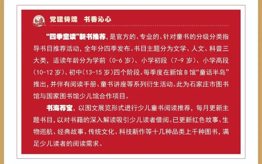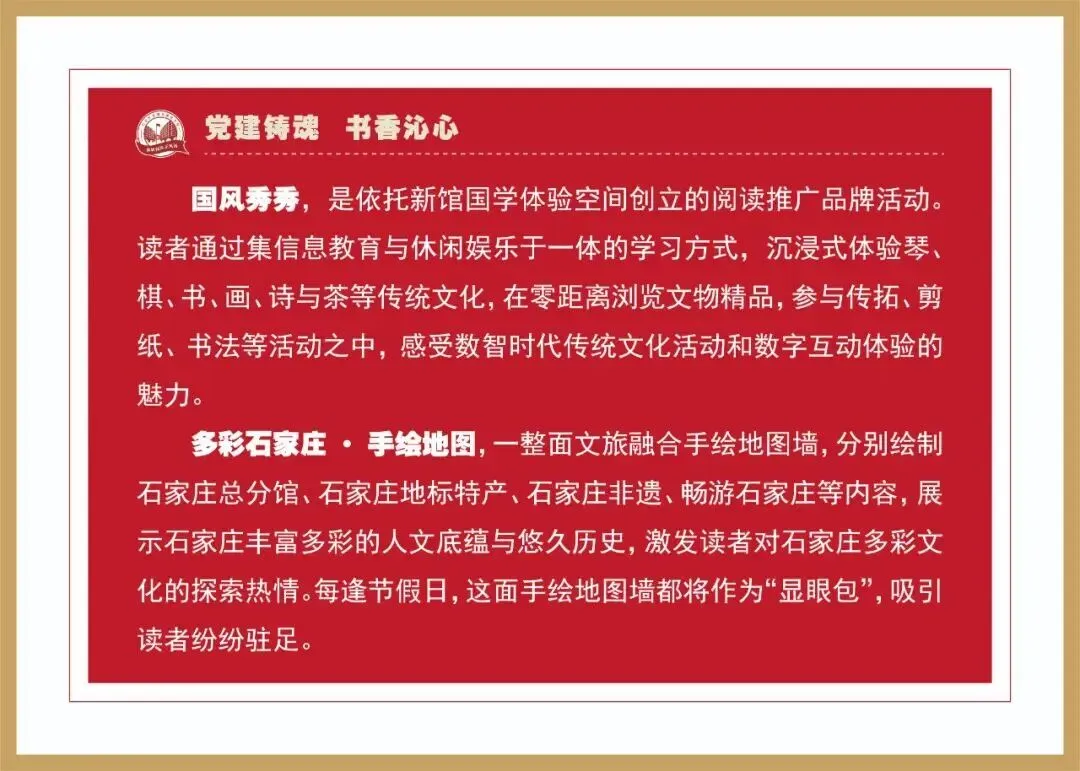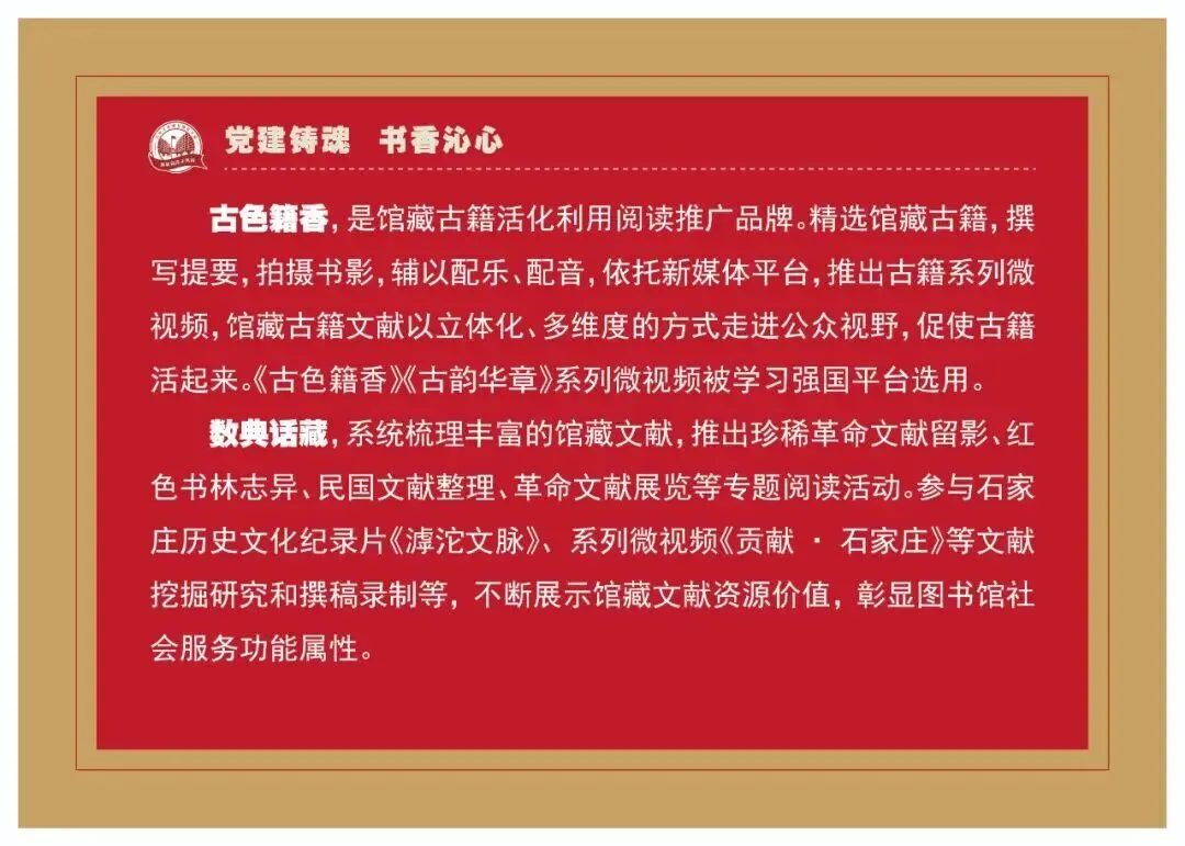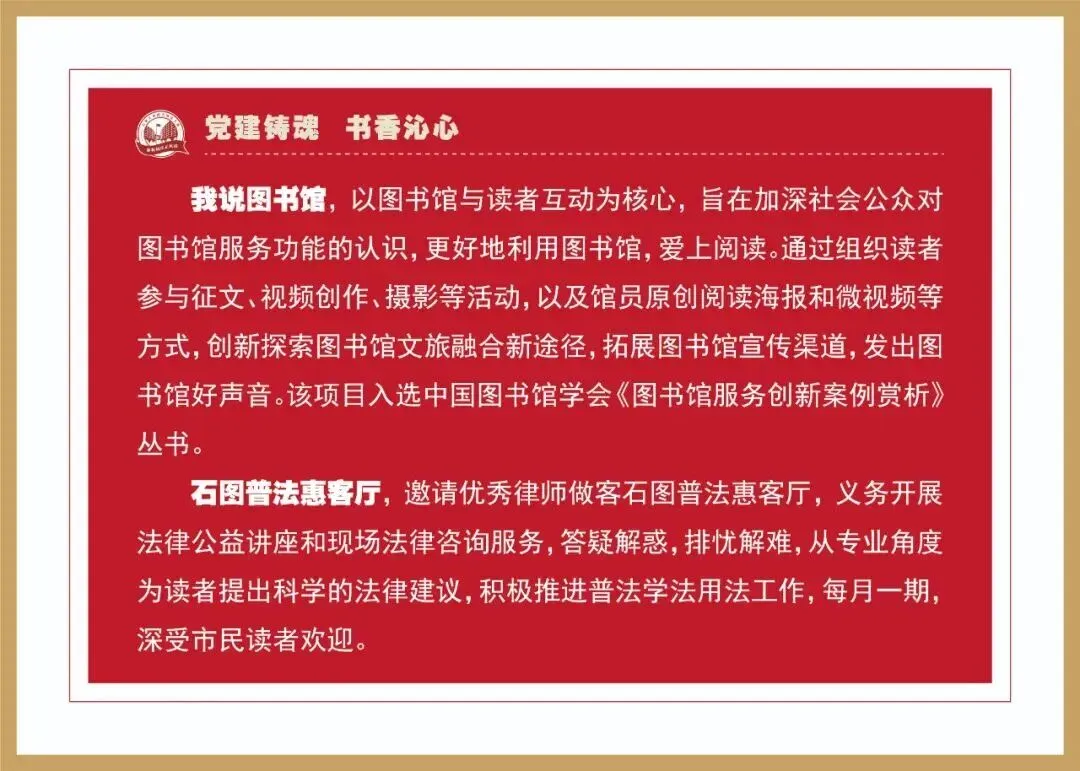 2025年以来,石家庄市图书馆发挥全民阅读主阵地功能和阅读赋能价值,以党建引领业务,以品牌凝聚力量,以阅读构筑未来,努力开创“少年老年全龄段、线上线下全时段、馆内馆外全方位”阅读推广服务新格局,以实干兴馆彰显公共文化服务担当,荣获全国“敬老文明号”“河北省扶残助残先进集体”等荣誉称号。