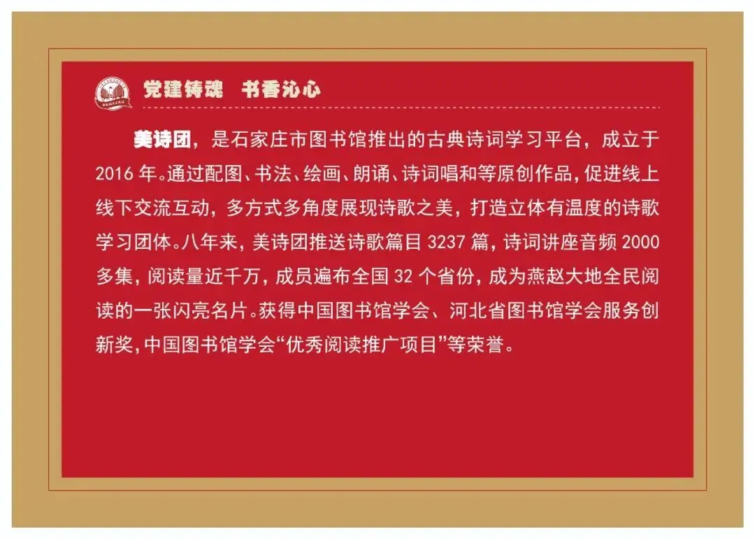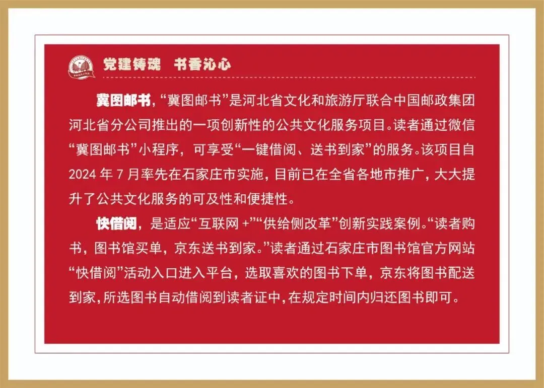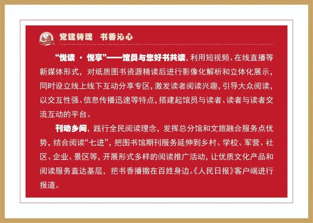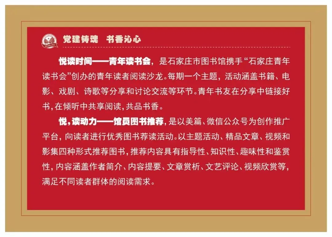 2025年以来,石家庄市图书馆发挥全民阅读主阵地功能和阅读赋能价值,以党建引领业务,以品牌凝聚力量,以阅读构筑未来,努力开创“少年老年全龄段、线上线下全时段、馆内馆外全方位”阅读推广服务新格局,以实干兴馆彰显公共文化服务担当,荣获全国“敬老文明号”“河北省扶残助残先进集体”等荣誉称号。