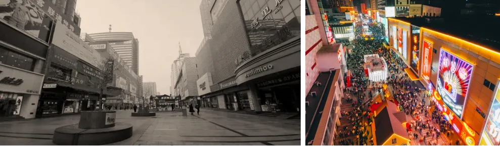 石家庄湾里庙步行街作为第二批国家级示范商业步行街创建试点,地处石家庄新华区东南,东起公里街,西至中华北大街,南起中山西路,北至新华路,主街全长 1080m,是随 19 世纪末正太铁路开通而兴起的百年古街,以其优越区位与深厚商业底蕴,长期作为城市最繁华地带,正太饭店、大石桥坐落在其附近,沿街拥有新百广场、太和电子城等 17 处大型商业设施,承载了石家庄厚重的历史文化,是城市建设发展的“原点”。然而,随着时代进步,传统批发市场与城市功能、消费需求不再匹配,街区业态低端、基础设施陈旧、运营模式落后导致经济效益、消费客流逐年下滑,导致街区面临挑战,影响了美丽省会城市的品质,提质升级迫在眉睫(图 1)。