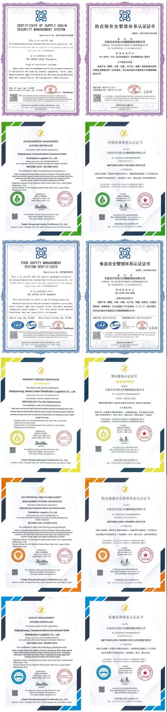 目前,中心已通过质量、环境、职业健康安全、食品安全、供应链安全五大管理体系认证,先后获评全国重点扶持市场、AAA级信用企业、河北省重点培育市场、市级蔬菜储备企业等多项荣誉,综合实力与品牌价值得到行业广泛认可。