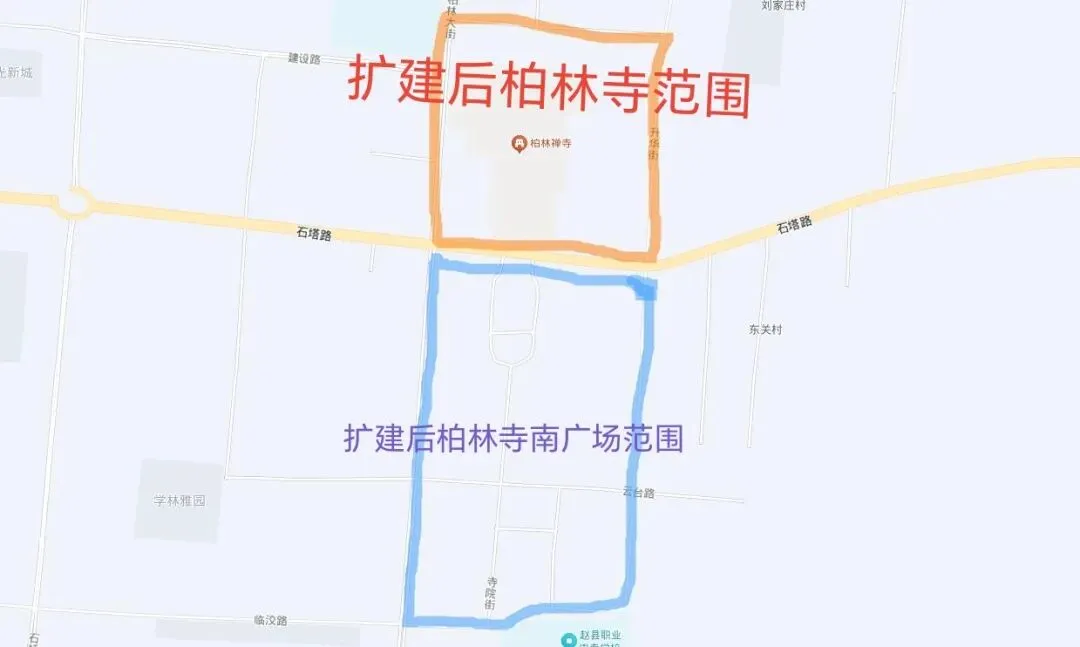 另外对禅寺南门广场进行腾退优化,范围东至升华街、西至柏林街、北至石塔路、南至临洨路,同时加宽石塔路(柏林街至龙腾路段),借鉴正定临济寺门前的规划模式,增设大面积绿地、休闲区及规范停车位等基础配套。