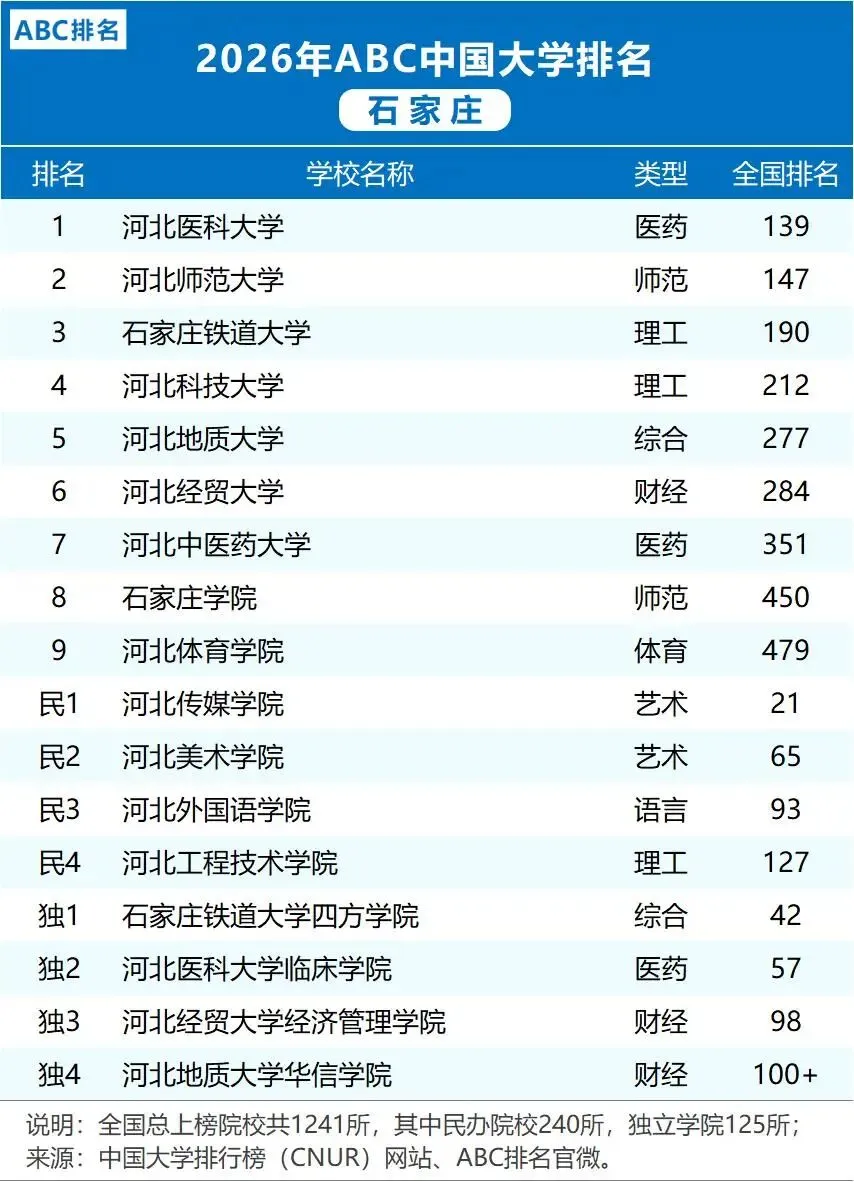 石家庄高校排名大公开:河北师范大学147,河北科技大学212,河北经贸大学284。近年来发布的2026年ABC中国大学排名,很好地显示了河北省政府下辖的省会石家庄市高等教育的布局。河北医科大学在全国139名中排在石家庄第一,体现出了它在医学方面很强的实力。紧随其后的是河北师范大学,全国排名第147位,是一所历史悠久的地方重点师范类高校,为河北省以及华北地区培养了大批基础教育师资力量。
