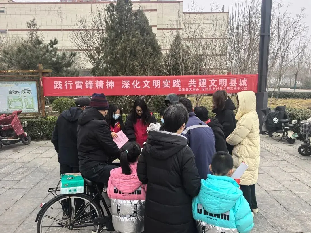 为大力弘扬雷锋精神,深化拓展新时代文明实践活动,推进文明城市常态化创建,近日,深泽县文明办、县新时代文明实践中心在北极台公园开展了以“践行雷锋精神,深化文明实践,共建文明县城”为主题的宣传活动,通过发放资料、现场讲解、互动交流等形式,向居民群众普及文明知识,倡导文明行为。