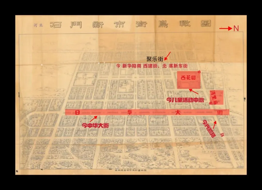 1939年日伪《石门新市街鸟瞰图》聚乐街。西侧,辟有四条南北向支巷——琵琶巷、芙蓉巷、樱桃巷、杨柳巷。花红柳绿的名字之下,藏着一套冰冷的殖民布局。