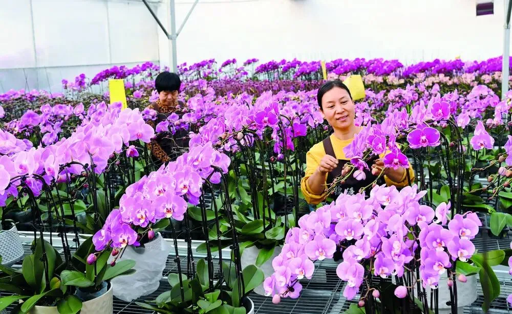 石家庄市藁城区孟村的智能温室大棚内,花农们正在对盛开的蝴蝶兰进行管理。(资料图片)