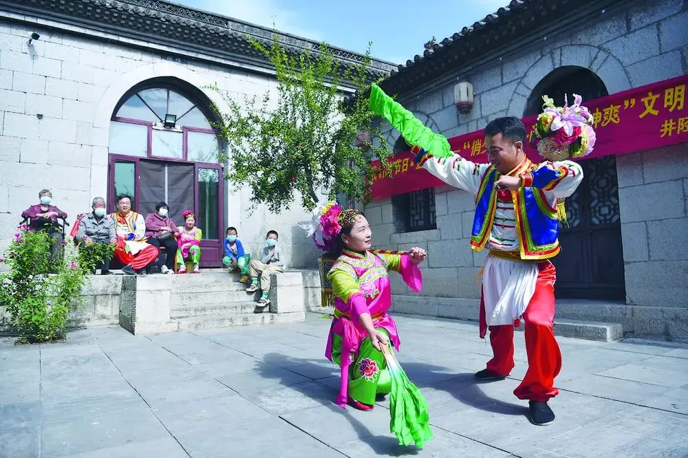 在石家庄市井陉县东南正村新时代文明实践驿站,志愿者为老年人表演井陉拉花,送上祝福。(资料图片)