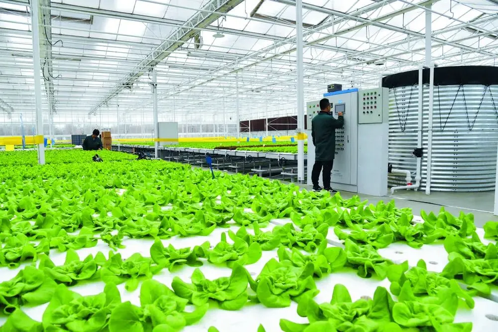 石家庄市鹿泉区的新兴际华(河北)农艺生态有限公司工作人员正在智能玻璃温室里对水培蔬菜进行管理。(资料图片)