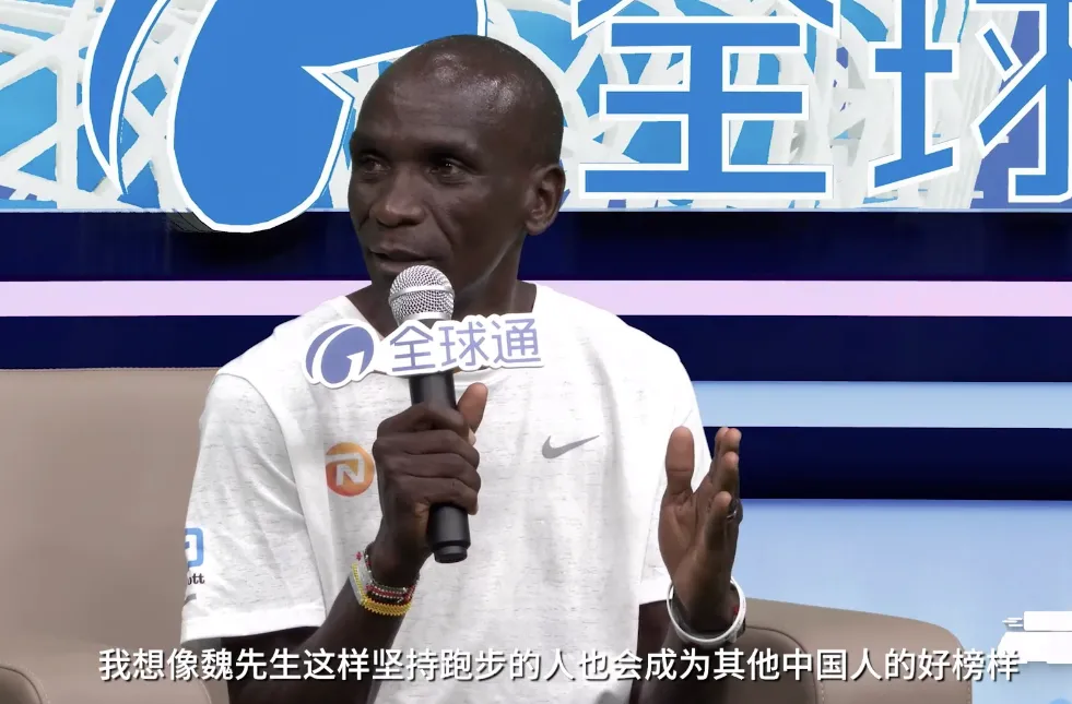 这份对奔跑的执着,早在2023年 “逐马计划” 直播间便打动了基普乔格。当时他与魏立华、中国马拉松纪录保持者何杰隔空对话,直言 “魏先生跑遍世界的坚持,会成为无数人的榜样”。