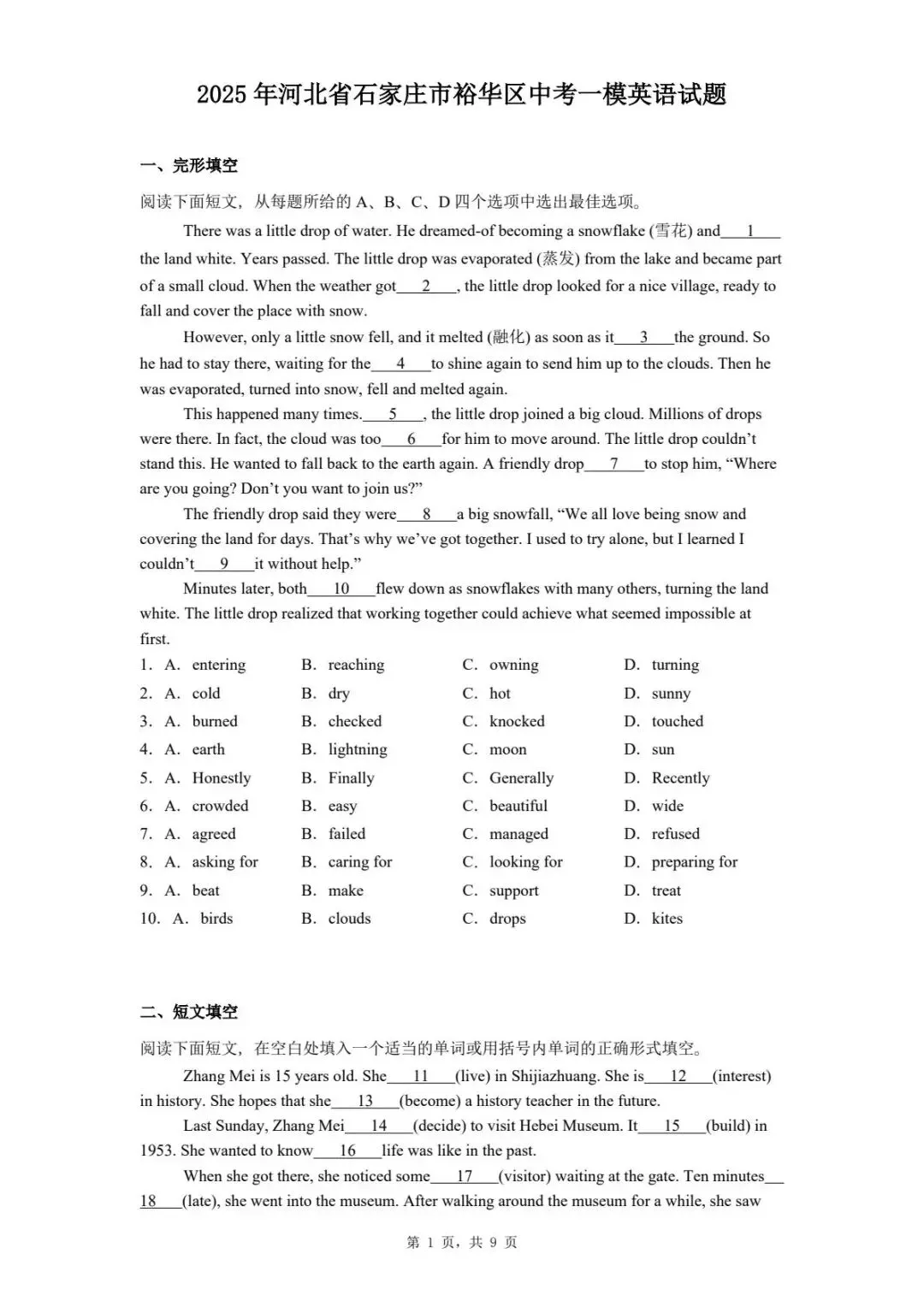 >2025年河北省石家庄市裕华区中考一模英语试题