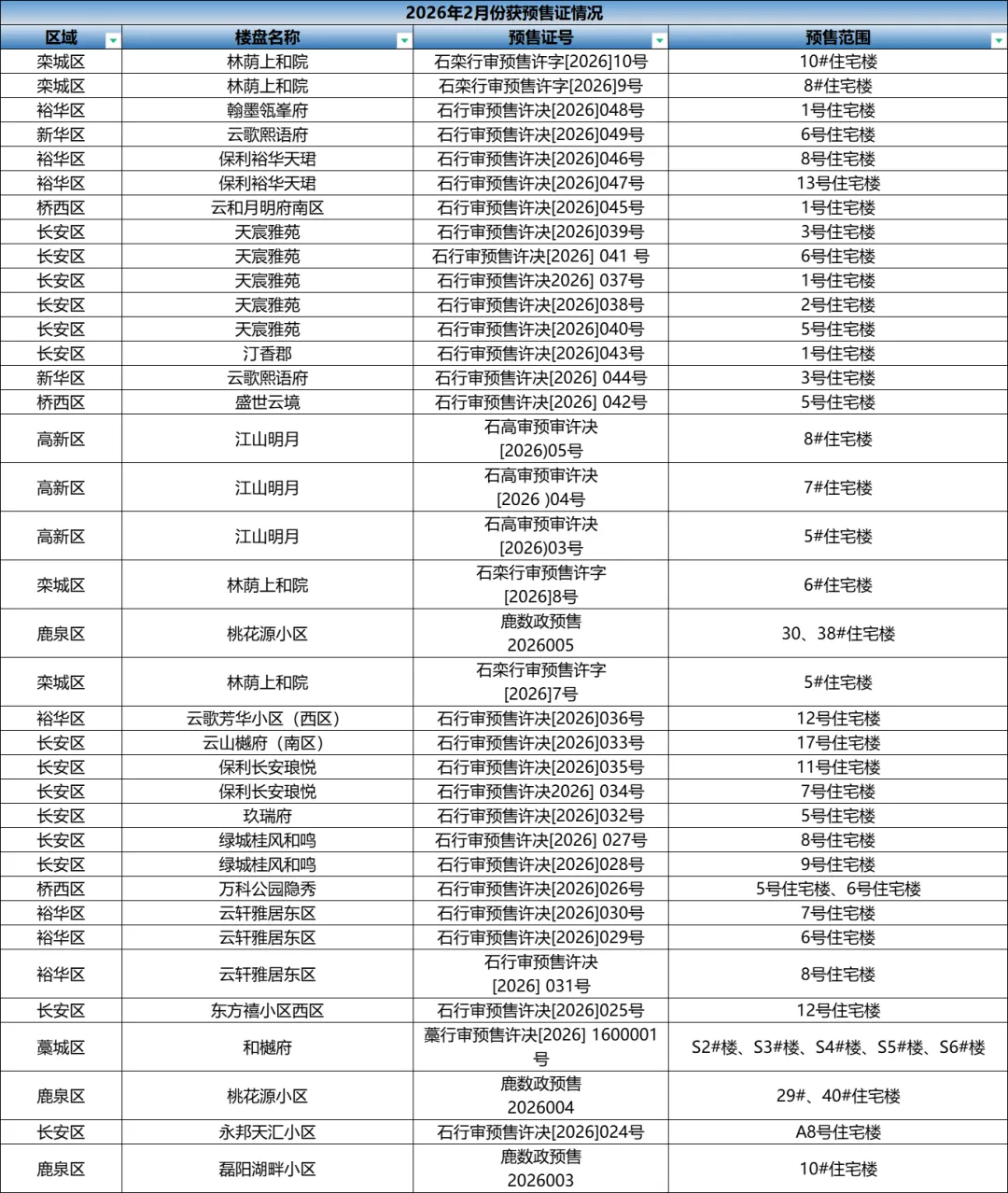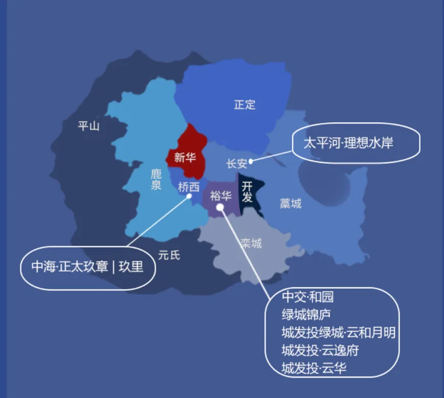 据石家庄安居客数据中心统计,2月石家庄共发放37张预售证。其中,长安区获证14张,裕华区获证7张,栾城区获证4张,桥西区、高新区、鹿泉区均获证3张,新华区获证2张,藁城区获证1张。