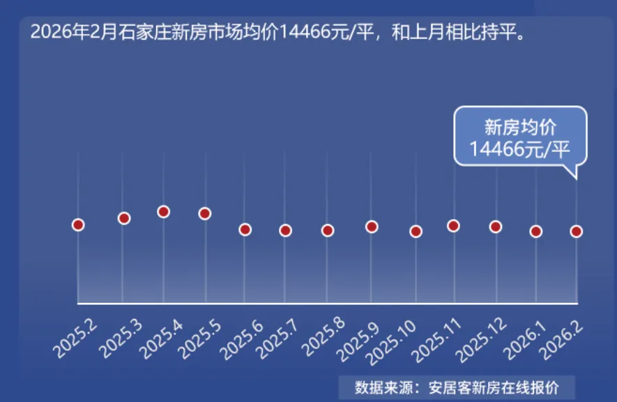 2026年2月石家庄新房市场均价14466元/平,和上月相比持平。