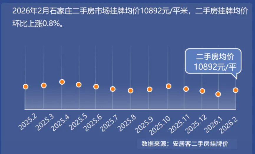 2026年2月石家庄二手房市场挂牌均价10892元/平米,二手房挂牌均价环比上涨0.8%。