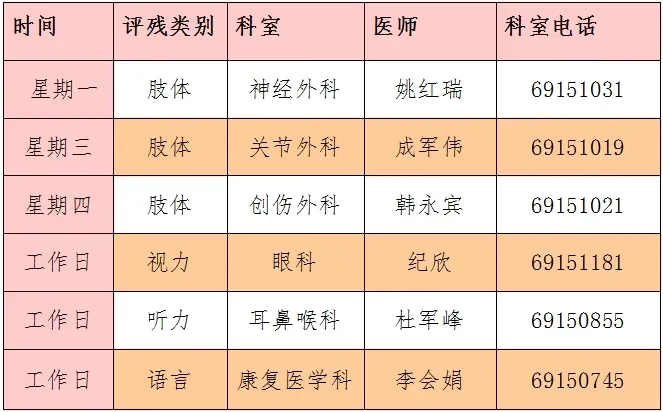 为方便残疾人朋友顺利办理残疾等级评定,现将我院残疾评定时间及人员安排告知如下: