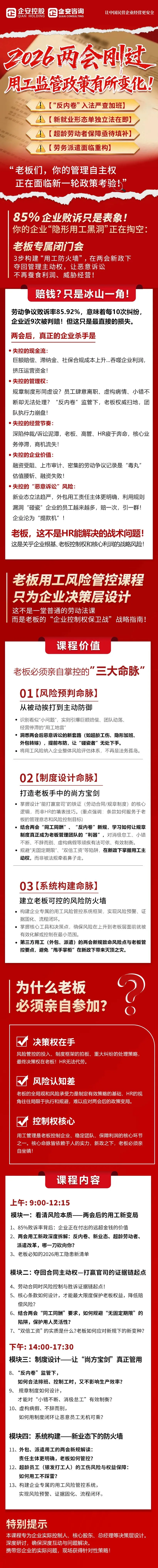 【主办单位】:企安咨询【课程日期】:2026 年 3月 17日【课程时间】:09:00 - 17:30【课程酒店】:石家庄诺华廷酒店(华强广场店)38楼金山棕会场【课程地址】:河北省石家庄市新华区诺华廷酒店【课程对象】:董事长、法人、股东、总经理、企业负责人( 敏感课题勿派其他人员参加)【学习费用】:3980元/人 ( 前20名优惠价680元/人 )【费用包括】:中餐费、场地费、资料费、学习费【报名方式】:以提前交费为准, 本期咨询会仅限30名企业家【订房信息】:房间248/间【停车信息】:停车免费【学习形式】:原理案例+方法+疑难解答【成果展示】:案例+工具演练+一对一辅导特别提醒: