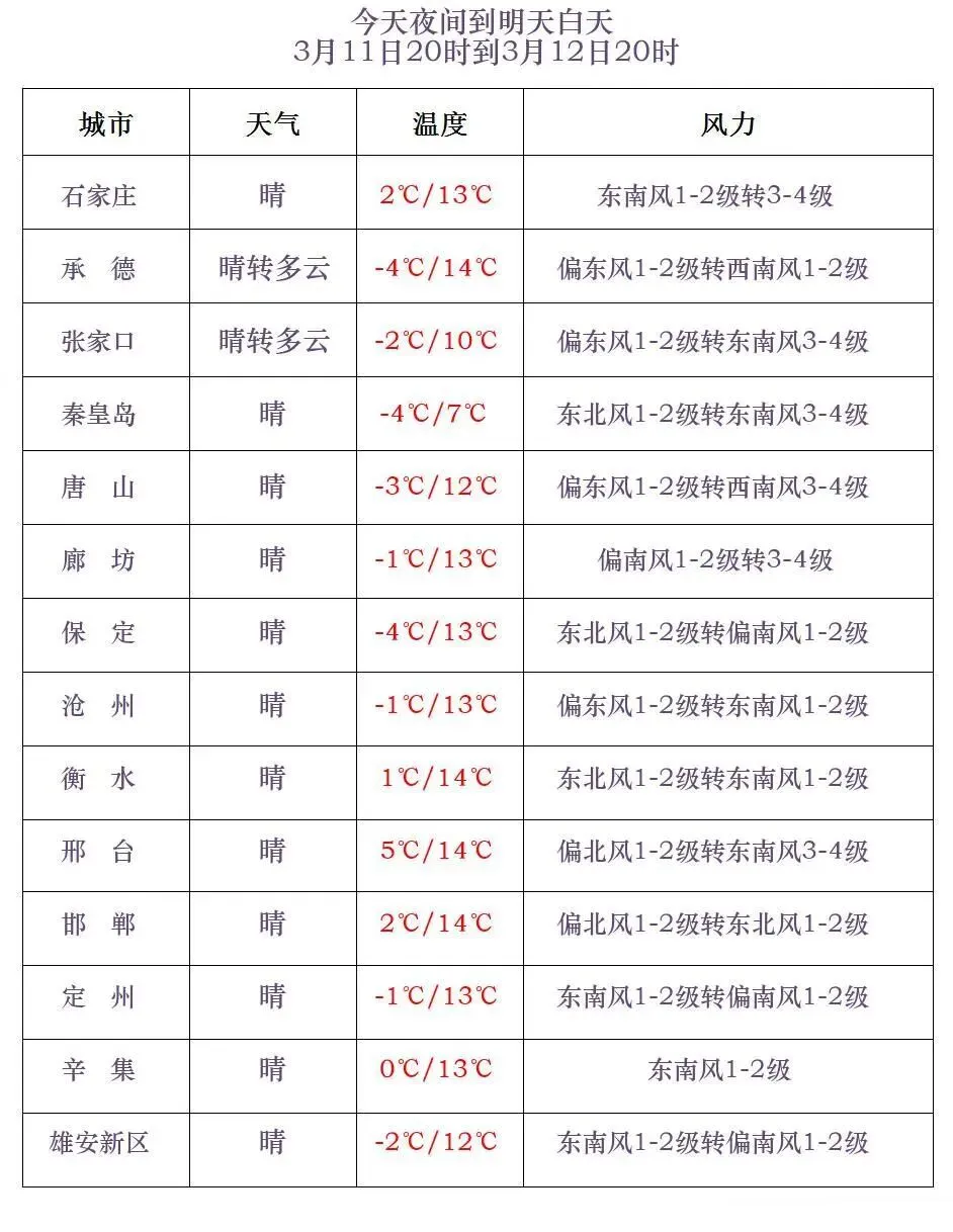 今天傍晚到夜间,全省晴间多云。最低气温,张家口北部、承德北部、秦皇岛北部-10~-5℃,其他地区-4~5℃。