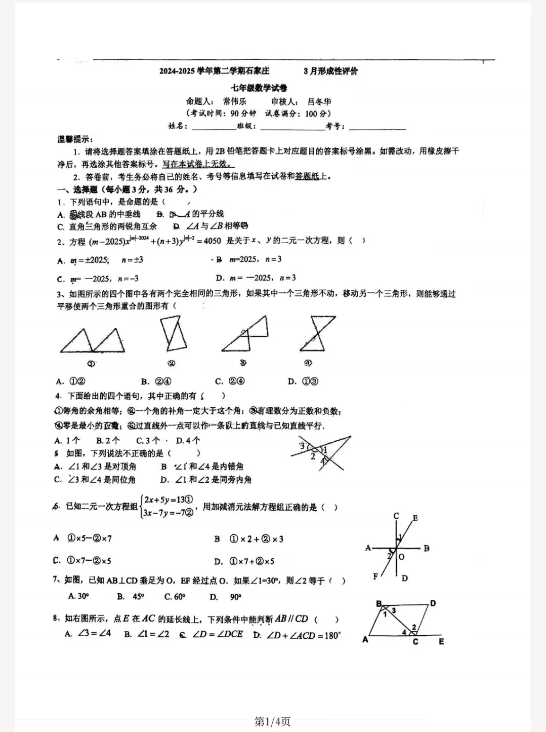 【七下月考】 2024-2025学年3月石家庄市9中七下阶段学情检测数学试卷(冀教版)
