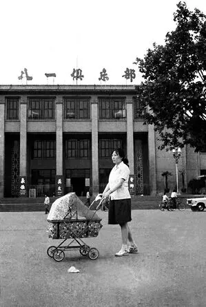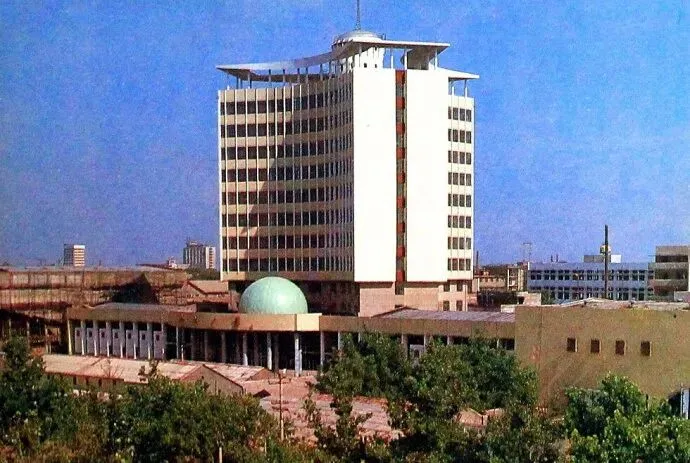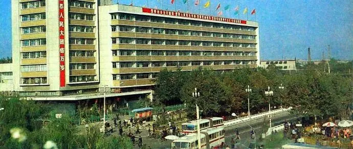 邮政大楼,外面贴着杏黄色的马赛克,楼顶上飘扬着彩旗,左侧条幅红底白字写着 “世界人民大团结万岁”。马路上红白涂装的公交车也是那个时代的符号。