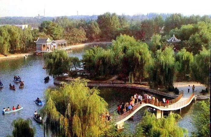 一座白色曲桥横跨湖面,桥上行人往来,左侧临水而建的水榭亭台,远处的六角亭,风景真的很美!