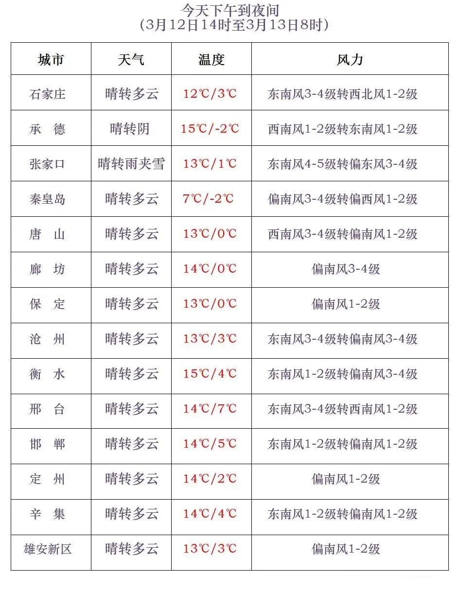 明天夜间到14日,张家口北部、承德北部阴转晴,张家口南部、承德南部、唐山北部、秦皇岛北部和保定、石家庄、邢台、邯郸四个地区的西部山区阴有小雪或雨夹雪,局地有中雪,其他地区阴有小雨,局地有中雨。