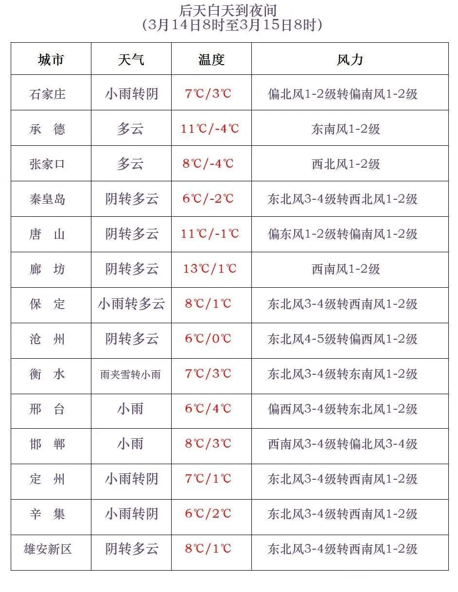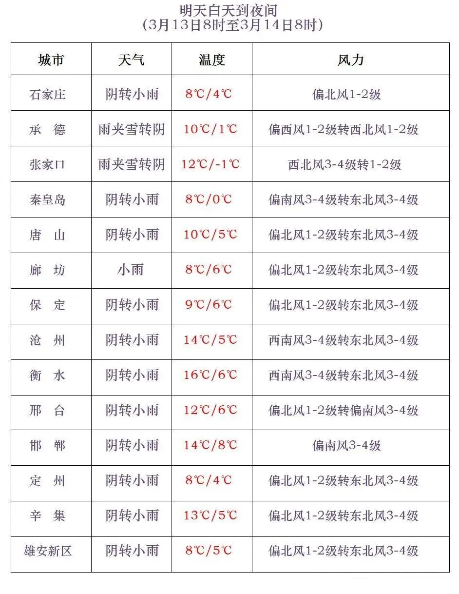 明天白天,全省阴,张家口北部、承德北部有小雪或雨夹雪,张家口南部、承德南部、唐山、秦皇岛、保定、廊坊北部、石家庄西部、邢台西部、邯郸西部有小雨或零星小雨。