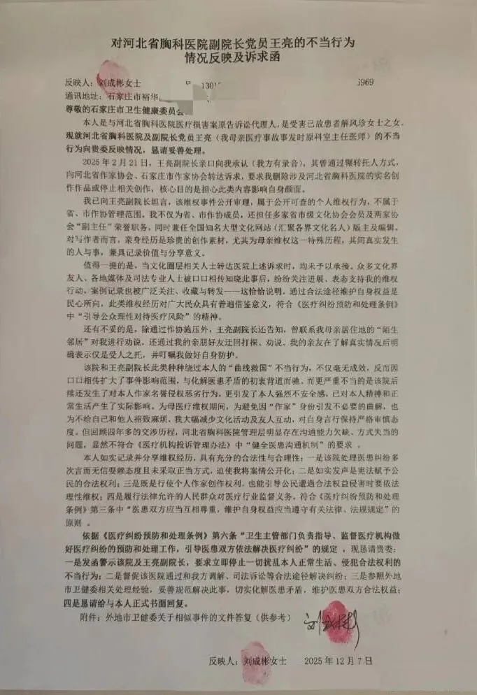 2025 年 12 月 7 日,相关诉求人通过 12345 政务服务便民热线,向石家庄市卫生健康委员会提交关于河北省胸科医院相关人员不当行为的情况反映,明确依据《医疗纠纷预防和处理条例》第六条 “卫生主管部门负责指导、监督医疗机构做好医疗纠纷的预防和处理工作,引导医患双方依法解决医疗纠纷” 的规定,提出四项诉求:发函警示涉事医院及相关人员停止不当行为、督促医院通过合法途径解决纠纷、参照外地市卫健部门处理经验妥善化解矛盾、获得正式书面回复,同时明确该诉求并非要求解决医疗纠纷赔偿或行政处罚事宜。