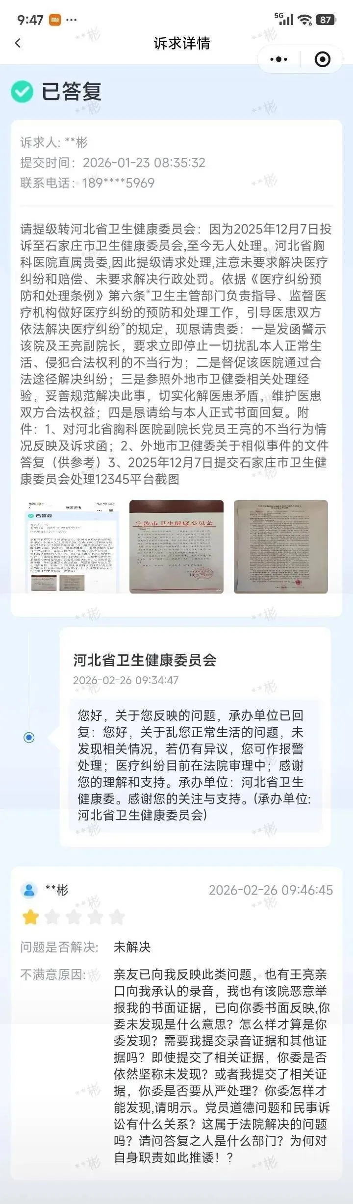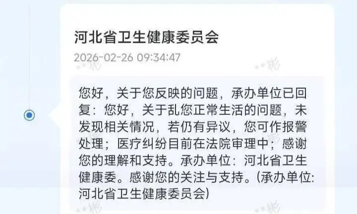 此类诉求的妥善处置,是检验卫生健康行政部门履职能力与服务效能的重要标尺,更是化解医患潜在矛盾、维护医疗领域秩序的关键环节。期待石家庄市卫生健康委员会正视此次诉求处置中显现的问题,对照《河北省 12345 政务服务便民热线管理办法》《医疗纠纷预防和处理条例》等相关规定,梳理工单处置流程中的薄弱环节,明确不同层级、不同管辖属性医疗机构相关诉求的处置规范,完善跨层级对接协调机制,提升 12345 热线工单处置的精准性与时效性,真正做到民有所呼、政有所应,以更规范的履职回应群众合理期待,切实维护医患双方的合法权益。