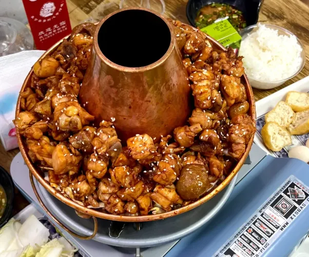 火锅鸡做法不复杂,先把鸡块下锅煸到微黄,再放蒜瓣、干辣椒和豆瓣酱炒香,添汤慢炖,最后下芹菜和青椒提味。关键不是猛辣,而是蒜香和鸡油融合,汤一滚,香气就贴着桌边走。