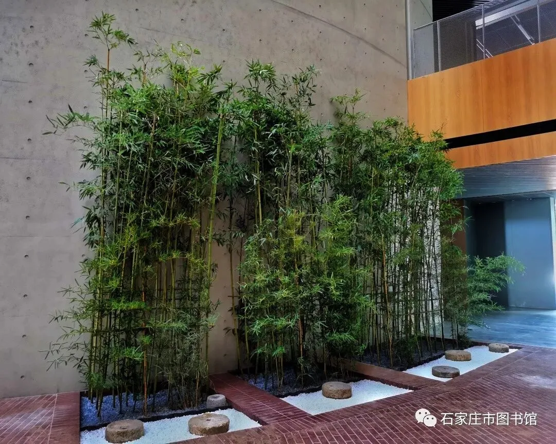 绿色理念:采用绿色建筑理念,每个功能区都有自然采光和通风。外墙采用全玻璃幕墙方式,阅览桌可直接借助室外漫射光采光,传递低碳节能理念。馆内外修竹丛立,诗意优雅。四个单体之间有园林绿化相衔接,同时配置智能化信息及管理系统,达到国内图书馆一流设计标准。