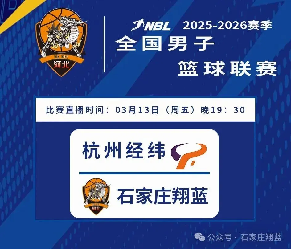 3月13日19点30分,石家庄翔蓝将在本赛季NBL联赛常规赛第二十三轮比赛中,客场挑战杭州经纬。