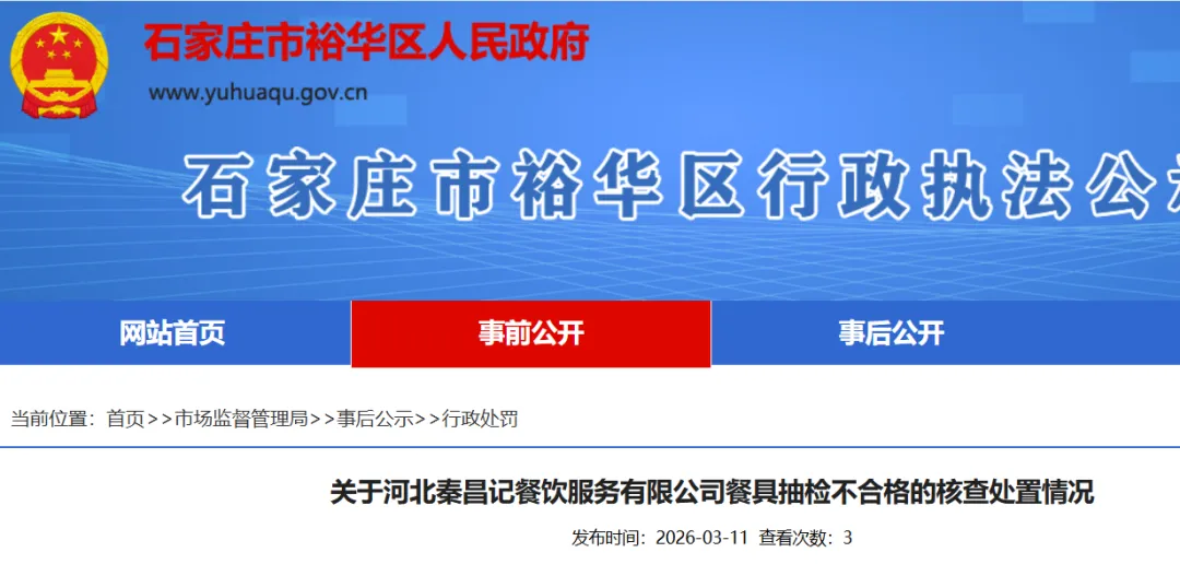2025年11月21日,石家庄市裕华区市场监督管理局委托河北翔致检测技术有限公司对河北秦昌记餐饮服务有限公司消毒餐具(碗)进行抽检,2025年12月3日,河北翔致检测技术有限公司出具检测报告(№:2025B26479),检验结论为不合格。2025年12月9日,我局向河北秦昌记餐饮服务有限公司送达检测报告,并现场下达责令改正通知书,责令该单位立即停止使用不合格餐具,整改完善消毒管理制度,确保餐具消毒后达标。