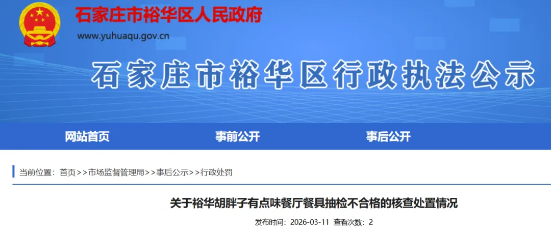 2025年11月21日,石家庄市裕华区市场监督管理局委托河北翔致检测技术有限公司对裕华胡胖子有点味餐厅消毒餐具(菜盘子)进行抽检,2025年12月3日,河北翔致检测技术有限公司出具检测报告(№:2025B26483),检验结论为不合格。2025年12月9日,我局向裕华胡胖子有点味餐厅送达检测报告,并现场下达责令改正通知书,责令该单位立即停止使用不合格餐具,整改并完善消毒管理制度,确保餐具消毒后达标。